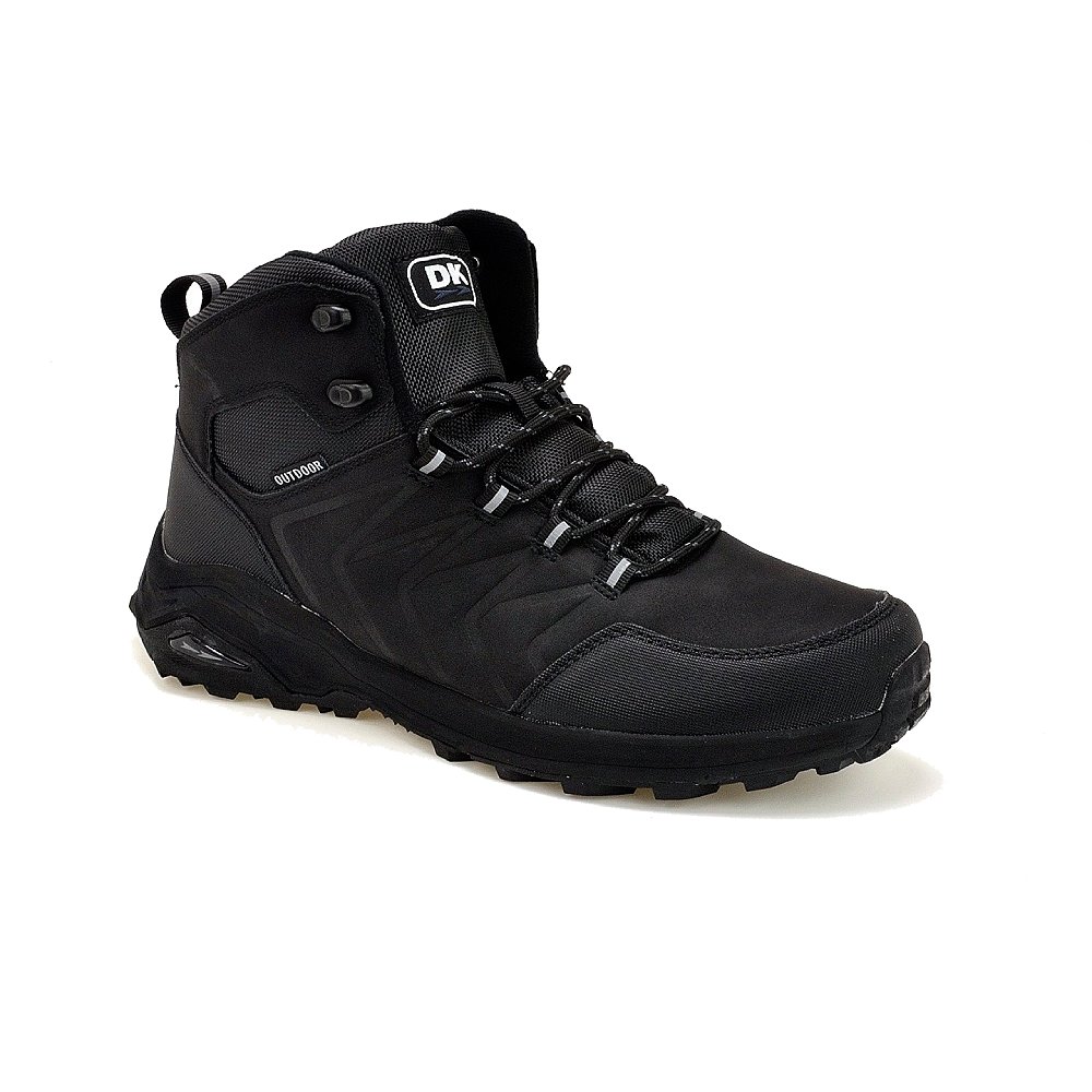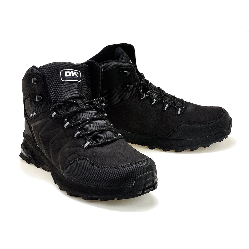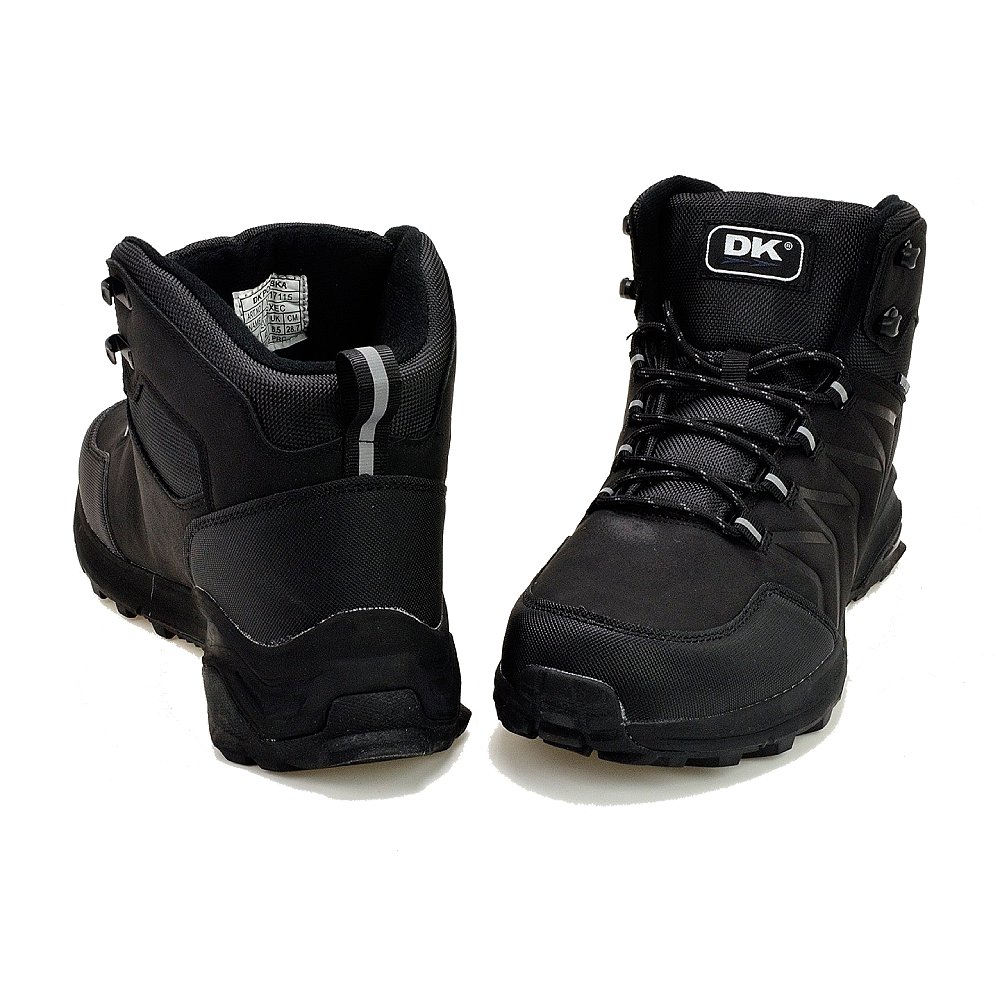 Czarne męskie buty trekkingowe DK VB17115 z cholewką z eko-skóry i materiału tekstylnego, ocieplone polarem. Wygodne, sznurowane, z podżelowaną wkładką i antypoślizgową podeszwą – idealne na zimę i wędrówki.
