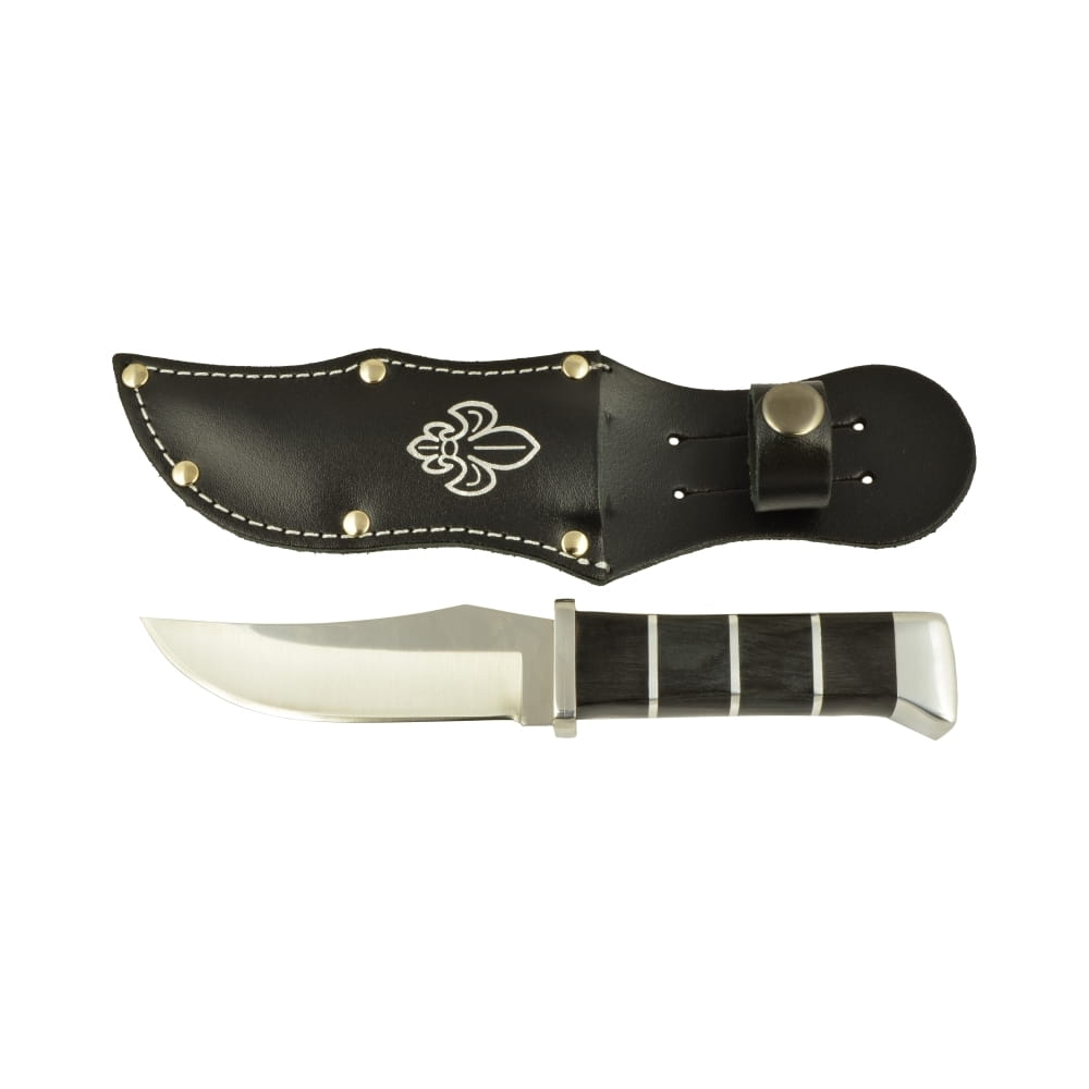 Finka harcerska Miran z czarnym pokrowcem skórzanym. Klasyczny nóż harcerski 20 cm ze stali nierdzewnej 420, wygodna rękojeść i skórzana pochwa z mocowaniem do pasa.