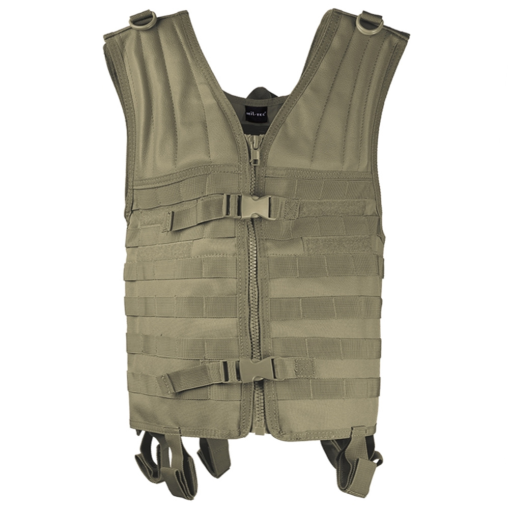 Kamizelka Molle Carrier Mil-Tec Olive to wszechstronna kamizelka taktyczna z systemem MOLLE, wykonana z trwałego poliestru, umożliwiająca pełną personalizację. Posiada liczne taśmy do montażu ładownic i kieszeni, a także rozpinane szlufki do mocowania pasa taktycznego. Kamizelka jest w pełni regulowana na ramionach i bokach (rozmiary M-XL), zapinana na solidny zamek błyskawiczny i dwie klamry fastex, co zapewnia stabilność i komfort użytkowania.