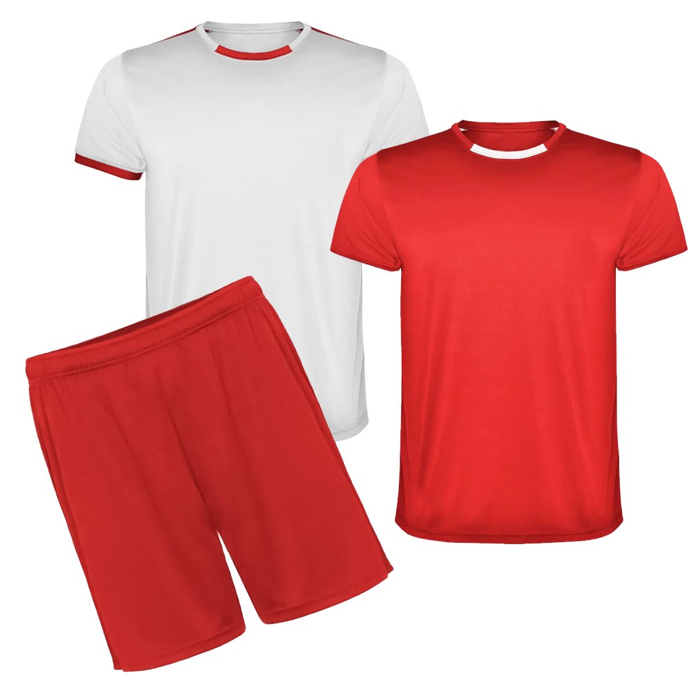 Skład zestawu: 2x koszulka (biała i czerwona), 1x spodenki (czerwone)
