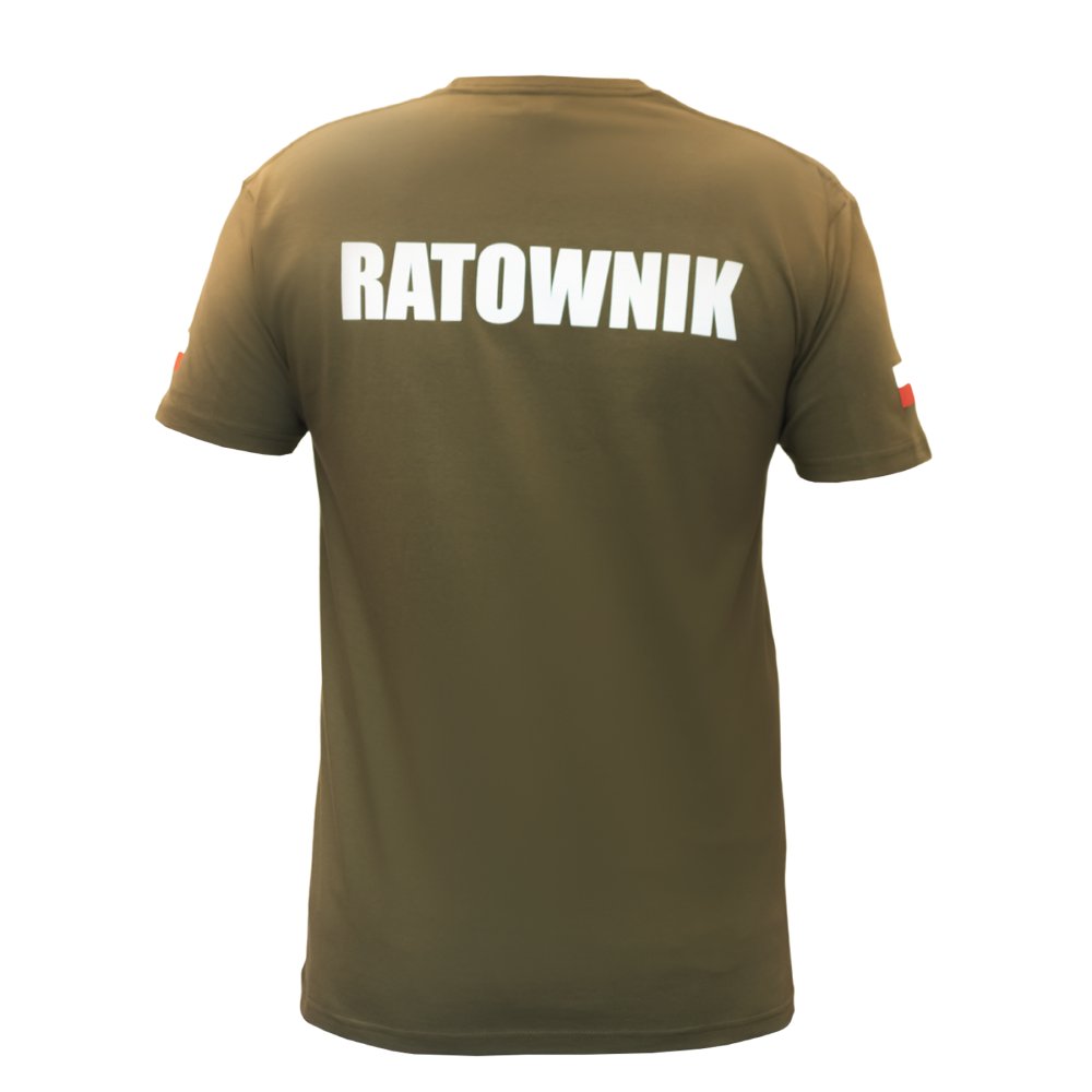 Koszulka T-Shirt Ratownik Olive – bawełniana koszulka 190 g/m² z napisem RATOWNIK, logo i flagami Polski na ramionach. Wygodny krój, nadruk sitodrukiem.