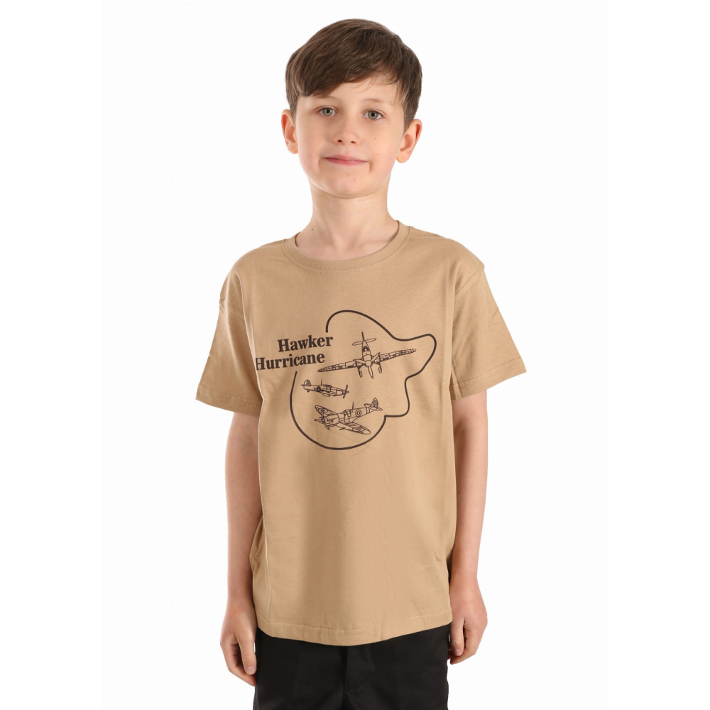 Historyczna grafika: Na przodzie znajduje się wyraźny, czarny nadruk przedstawiający sylwetki samolotów Hawker Hurricane w locie, co nadaje koszulce unikalnego, technicznego stylu.
