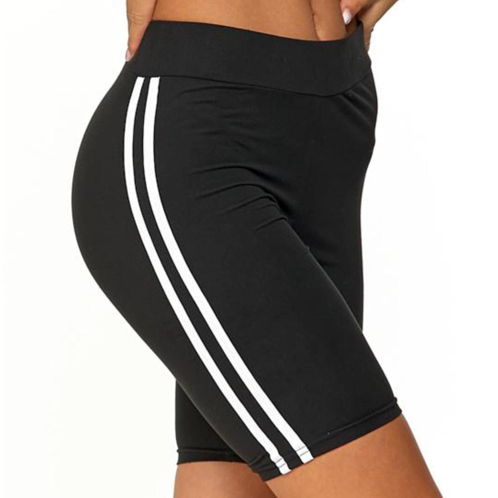 Dodatkowym elementem stylistycznym są białe, klasyczne lampasy umieszczone po bokach nogawek. Nadają one legginsom sportowo-miejskiego charakteru i modnego „twistu”, dzięki czemu kolarki świetnie pasują zarówno do stylizacji treningowych, jak i casualowych.