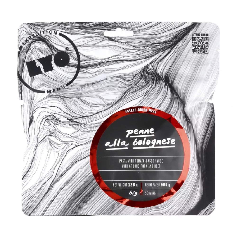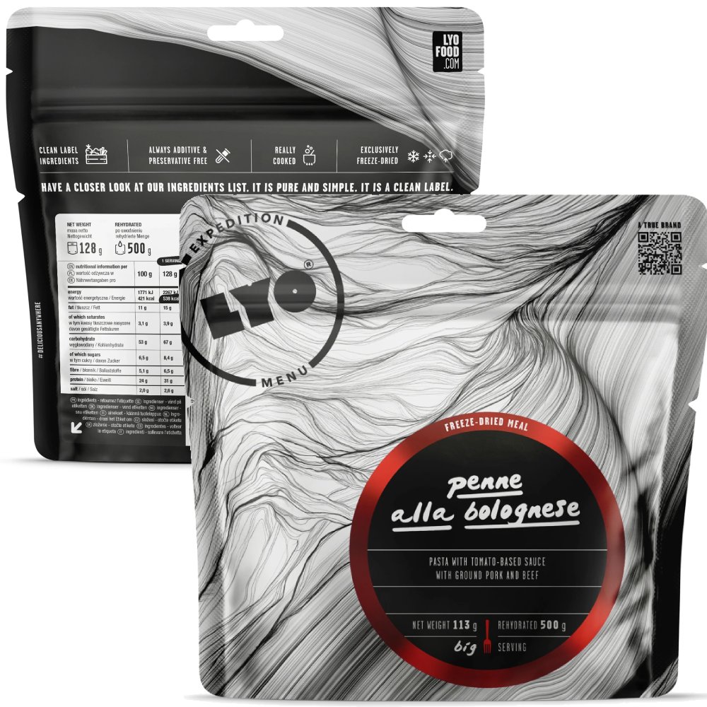 Posiłek liofilizowany LYOFOOD Penne à la bolognese 500 g został przygotowany wyłącznie z naturalnych składników, bez dodatku konserwantów i sztucznych substancji. To pełnowartościowy, sycący obiad outdoorowy, który doskonale sprawdzi się podczas długich wędrówek, wypraw i kempingów.