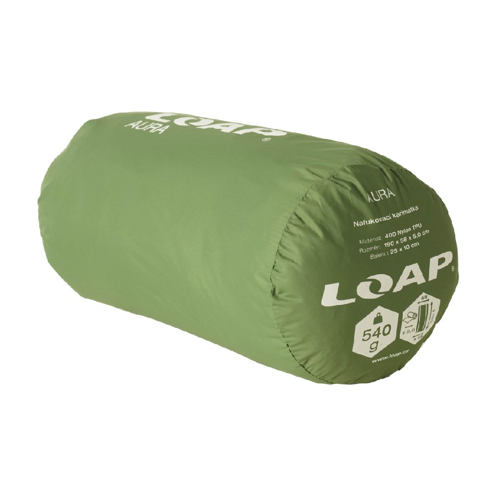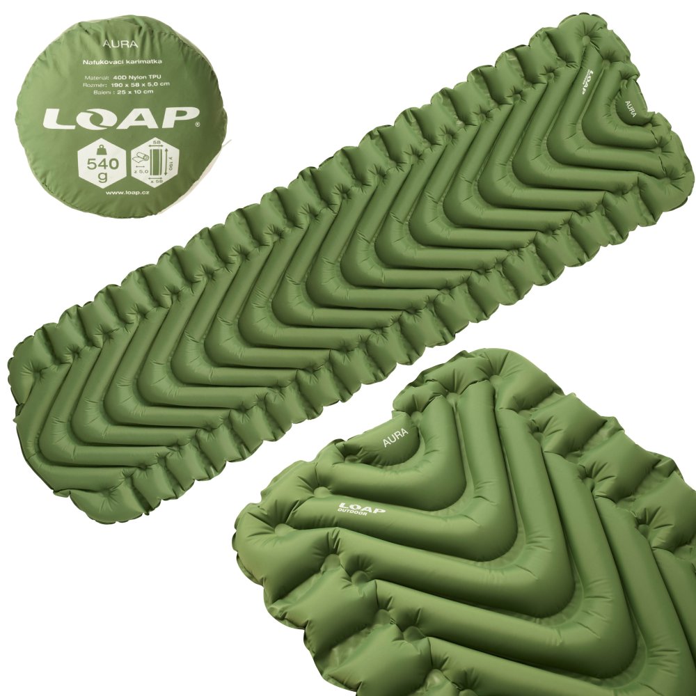 Mata dmuchana Loap Aura N24N Green – lekka, trwała i kompaktowa mata turystyczna. Nośność 200 kg, wysokość 5 cm. Idealna do namiotu i biwakowania.