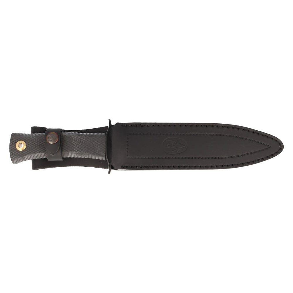 W zestawie znajduje się skórzane etui w kolorze czarnym, ozdobnie przeszywane i zapinane na zatrzask. Pochwa posiada tłoczone logo producenta oraz mocowanie do pasa, umożliwiające wygodne przenoszenie noża w pozycji pionowej.