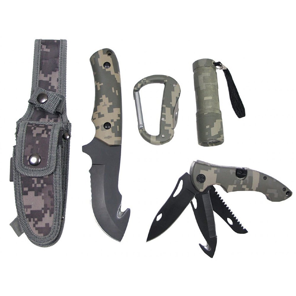 Dzięki połączeniu noża taktycznego, scyzoryka, karabińczyka wielofunkcyjnego, latarki LED i solidnego pokrowca, otrzymujesz niezawodne wsparcie w każdej sytuacji outdoorowej.