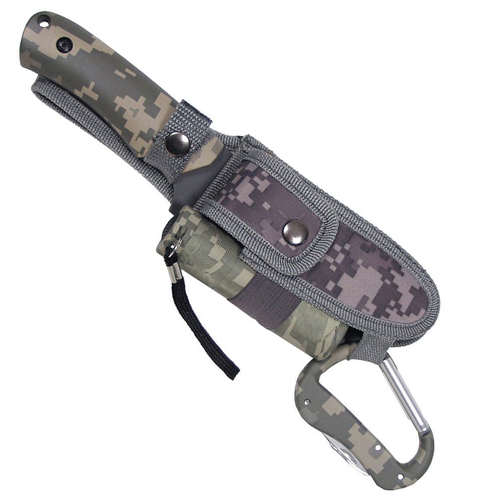 Wielofunkcyjny zestaw survivalowy MFH 5w1 – nóż, scyzoryk, karabińczyk, latarka LED i pokrowiec