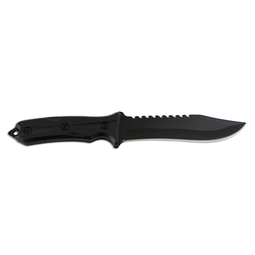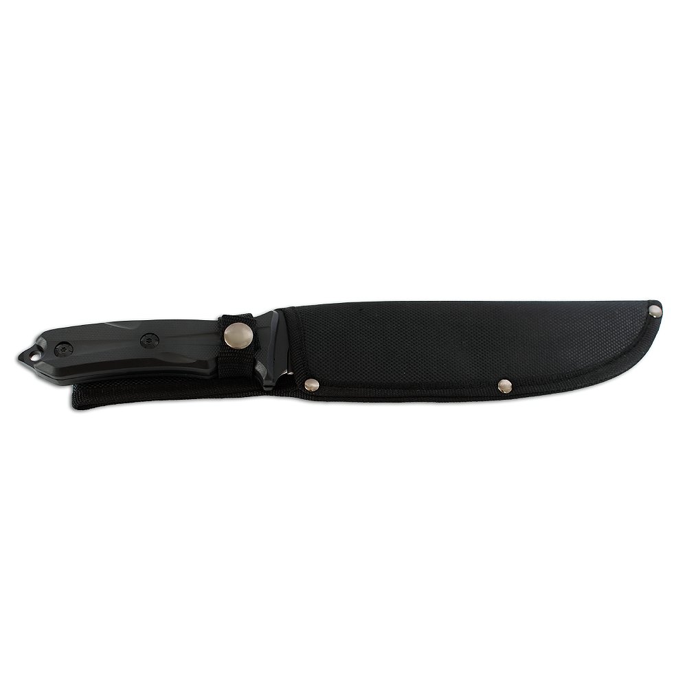 Rękojeść noża została wykonana z wytrzymałego tworzywa i pokryta antypoślizgową fakturą, która zapewnia pewny chwyt nawet w trudnych warunkach atmosferycznych. Liczne wyżłobienia i jelec dodatkowo chronią palce oraz zwiększają komfort użytkowania.