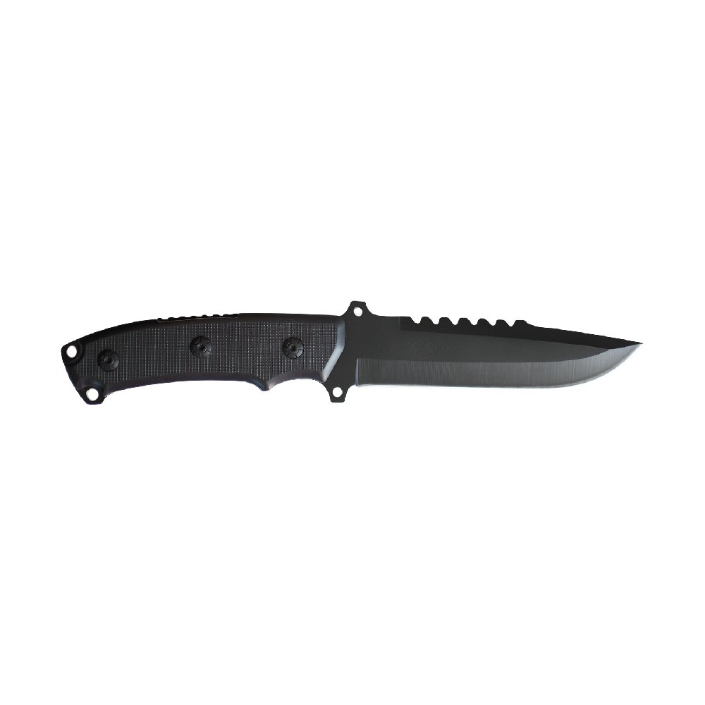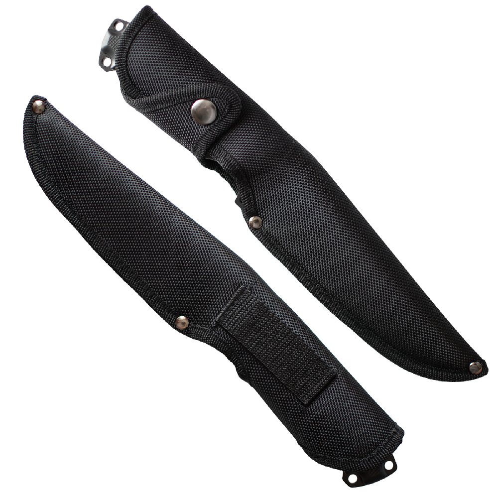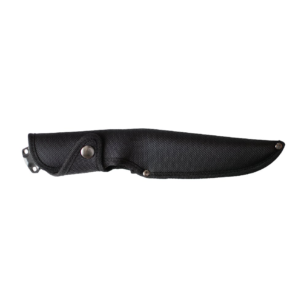 Na końcu rękojeści znajdują się otwory, umożliwiające przytroczanie noża według indywidualnych potrzeb. W zestawie producent dołącza wytrzymały, parciany pokrowiec z możliwością przypięcia do pasa, co pozwala na wygodne przenoszenie noża.