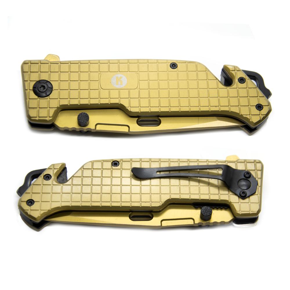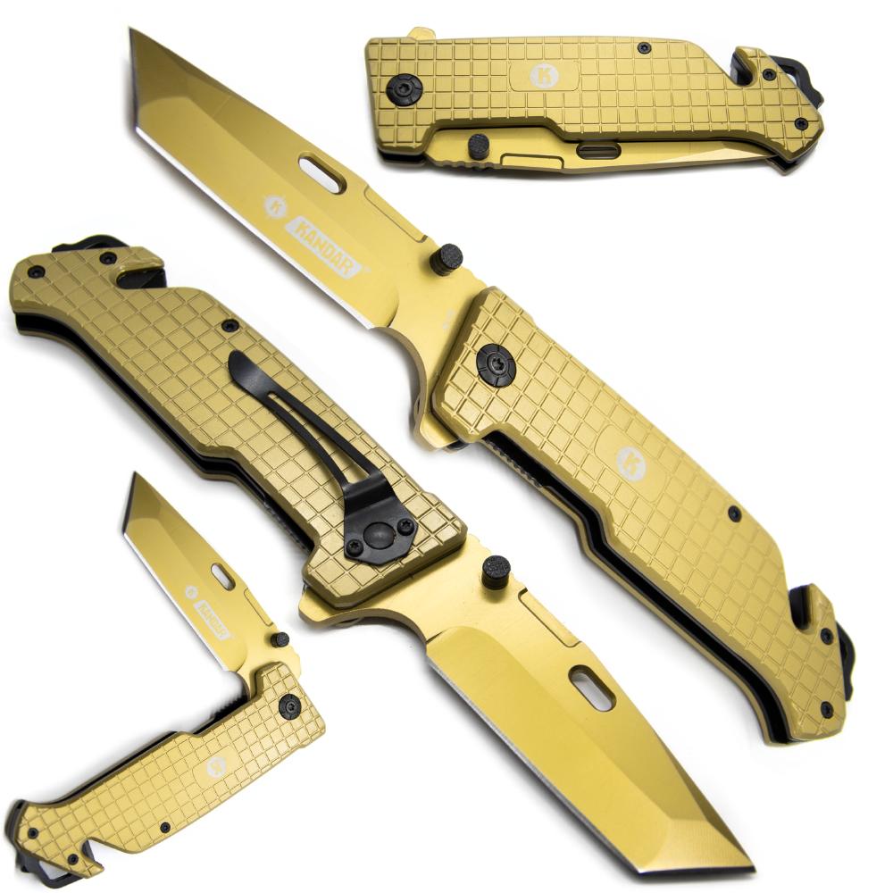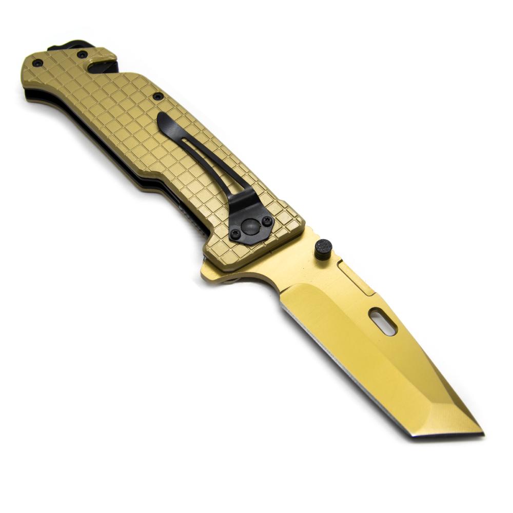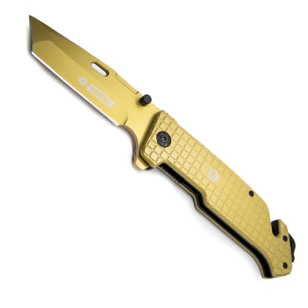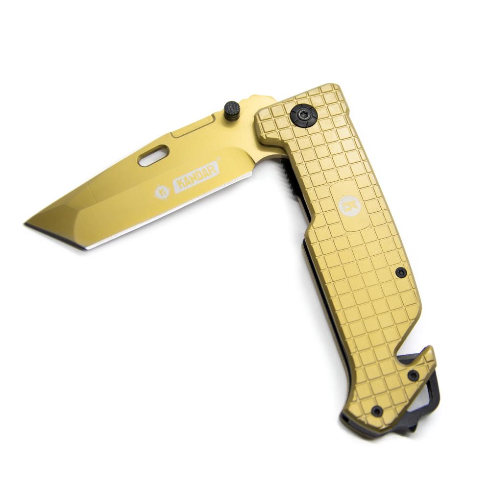 Nóż taktyczny Kandar N16 Tanto Gold – składany nóż ratowniczy ze stali 440, ostrze 9,5 cm, blokada Liner-Lock, zbijak do szyb, przecinak pasów. Złote wykończenie Tanto.