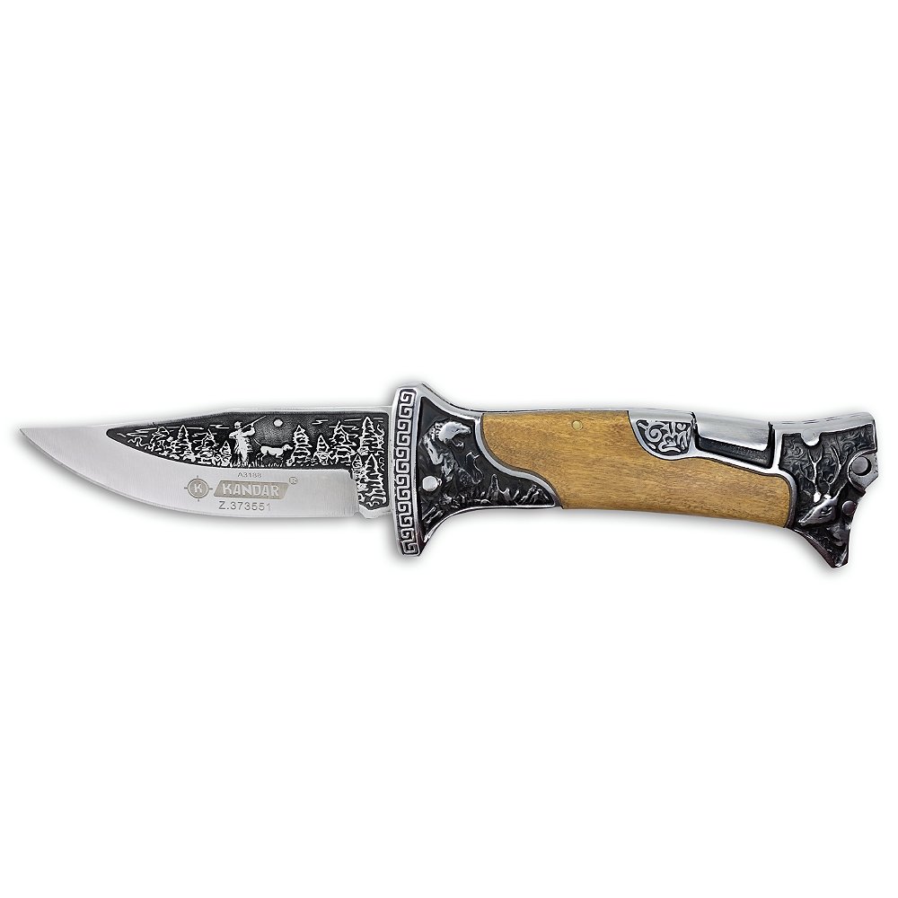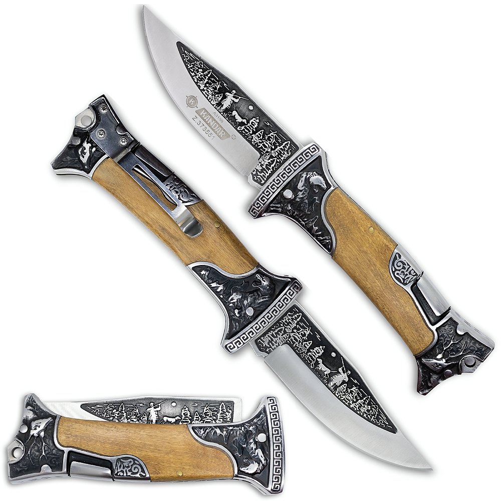 Składany nóż myśliwski Kandar N317 ze stali nierdzewnej Z.373551. Grawerowana głownia i rękojeść, blokada Back-Lock, drewniane wstawki i klips do paska. Idealny na prezent dla myśliwego.