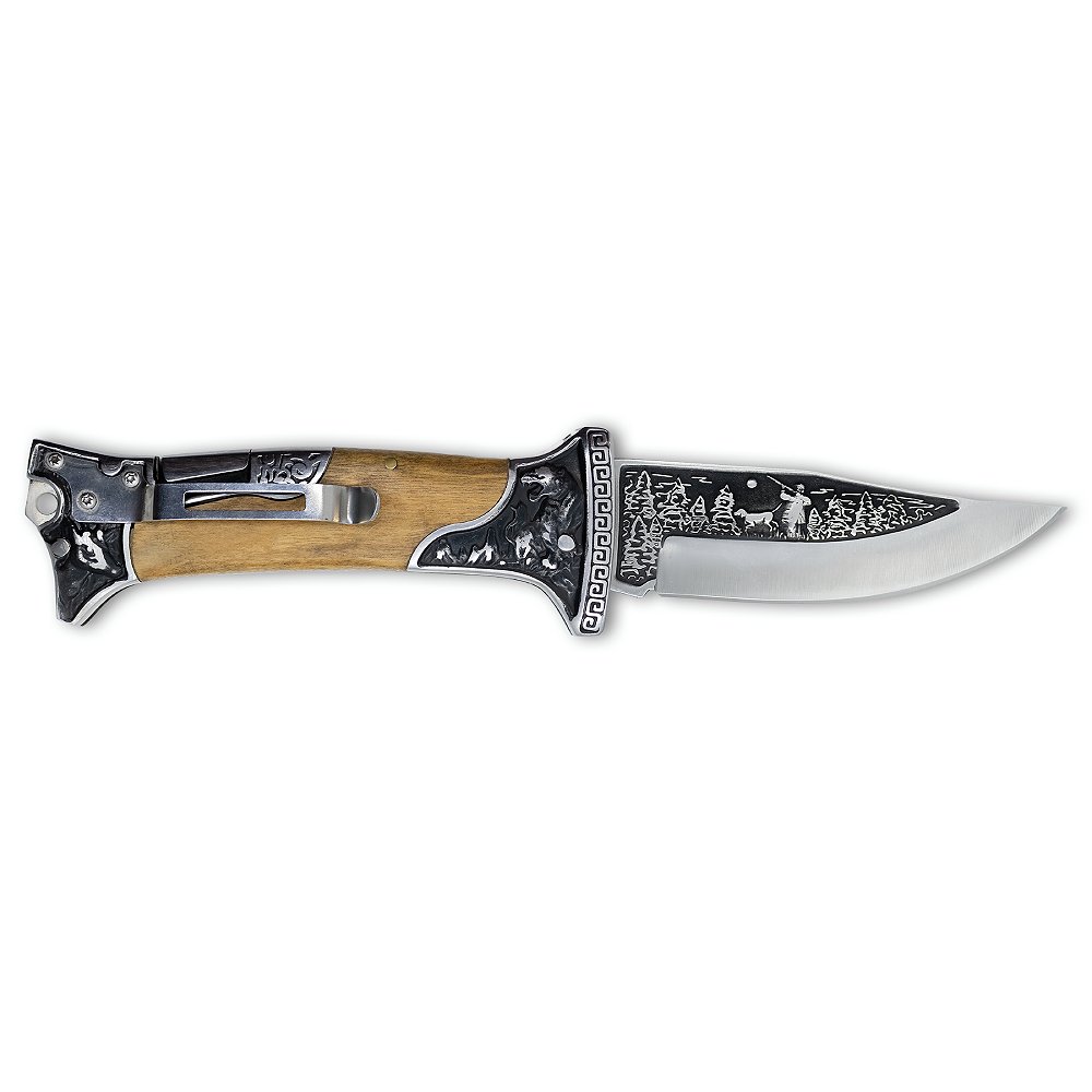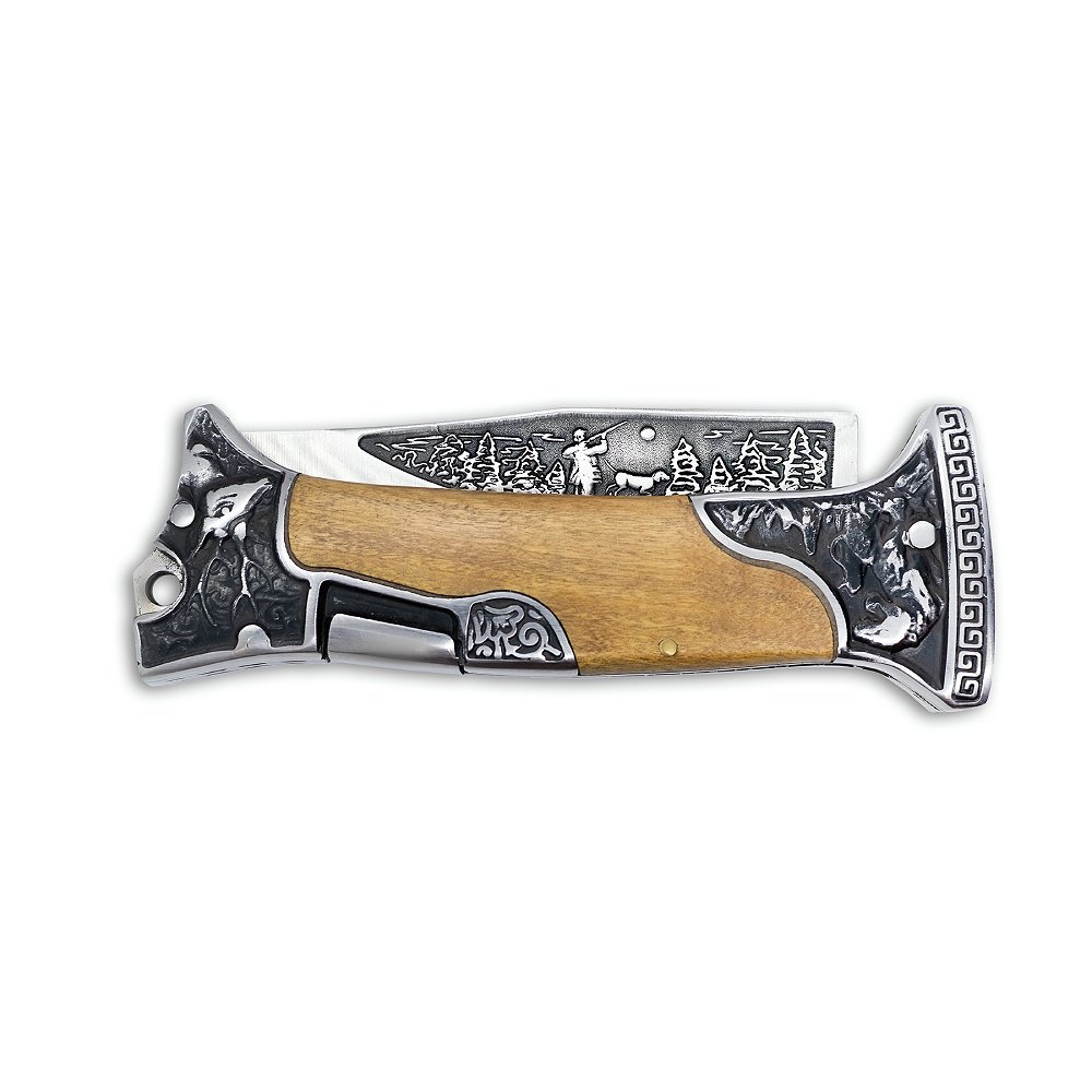 Kandar N317 to składany nóż myśliwski, który łączy praktyczność z eleganckim wykończeniem. Dzięki bogatym grawerom na głowni i rękojeści, przedstawiającym sceny polowania, model ten wyróżnia się niebanalnym stylem, przez co doskonale sprawdzi się również jako prezent dla myśliwego czy kolekcjonera.