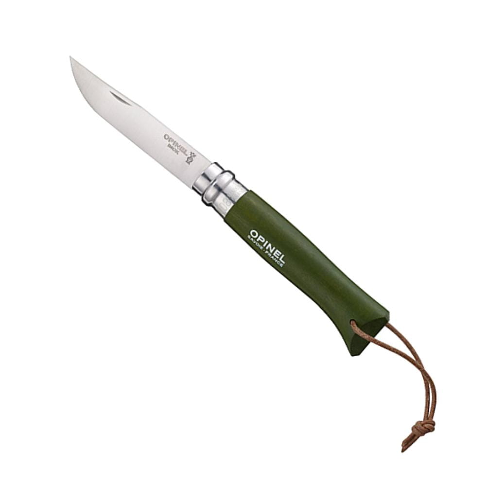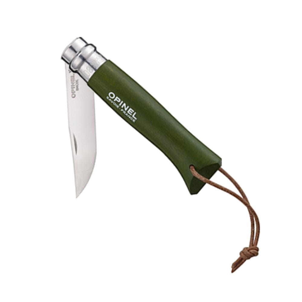 Opinel Colorama No. 8 Khaki – składany nóż turystyczny z drewnianą rękojeścią grabową i stalą Sandvik 12C27. Blokada Virobloc, rzemień brelok. Francuska jakość.