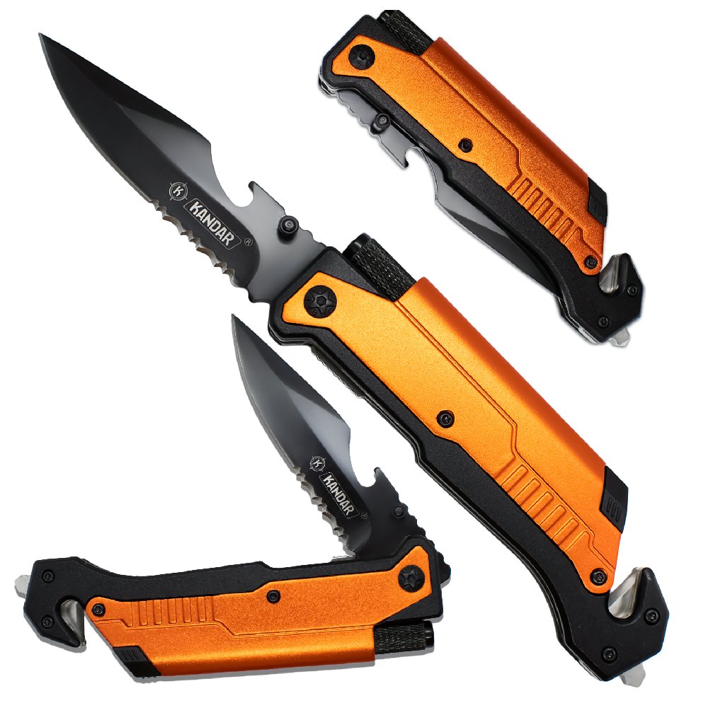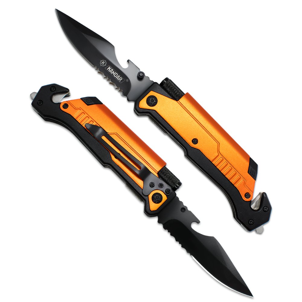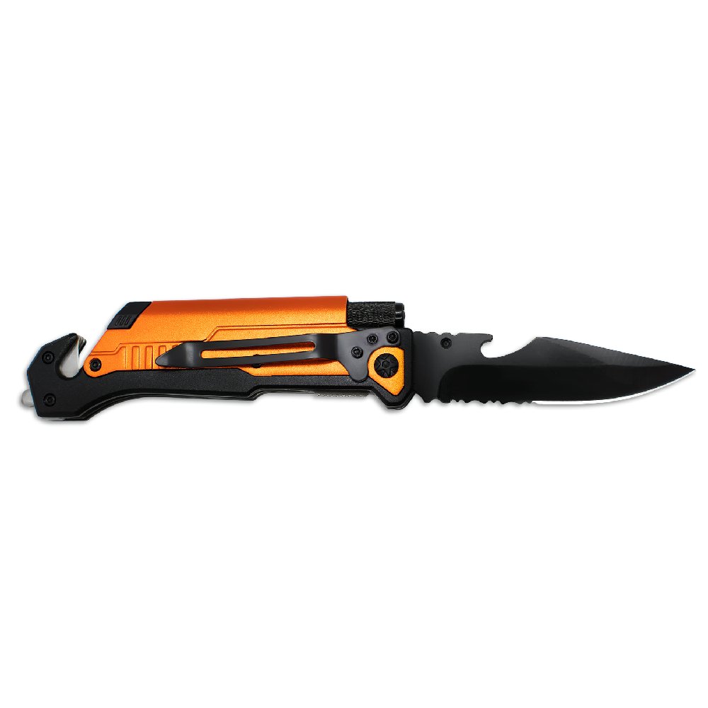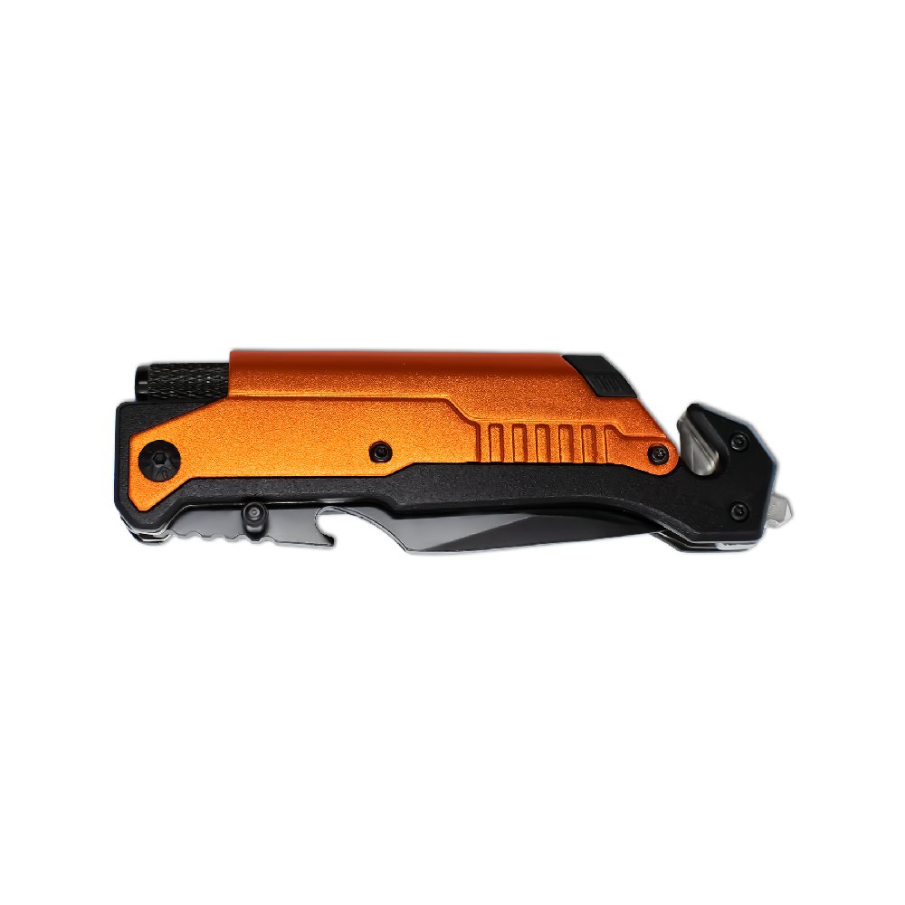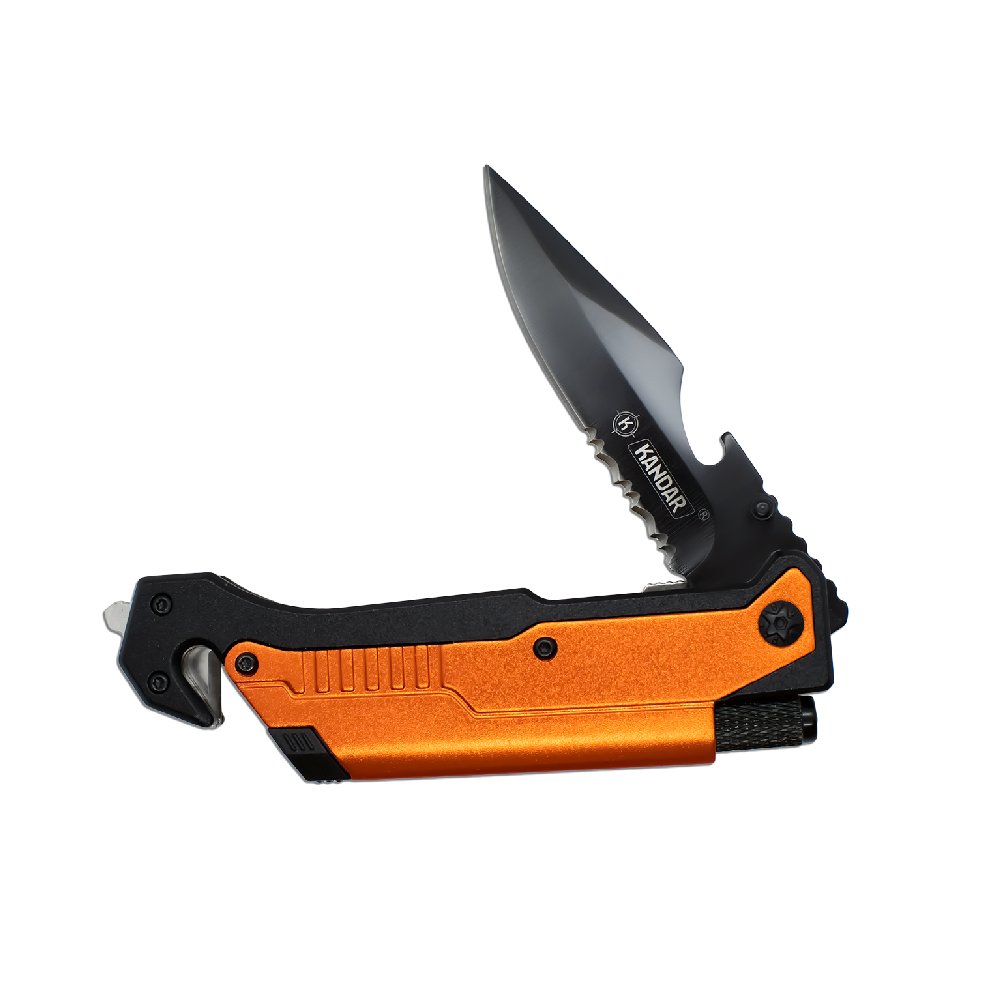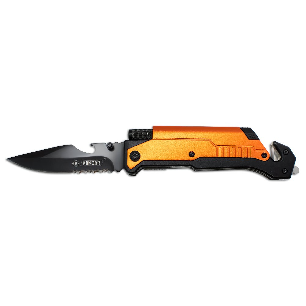 Nóż ratowniczy Kandar JM-K16 – składany nóż survivalowy ze stali nierdzewnej 440 z krzesiwem, latarką, zbijakiem do szyb i przecinakiem pasów. Idealny do samochodu, survivalu i EDC.