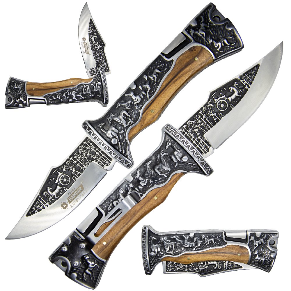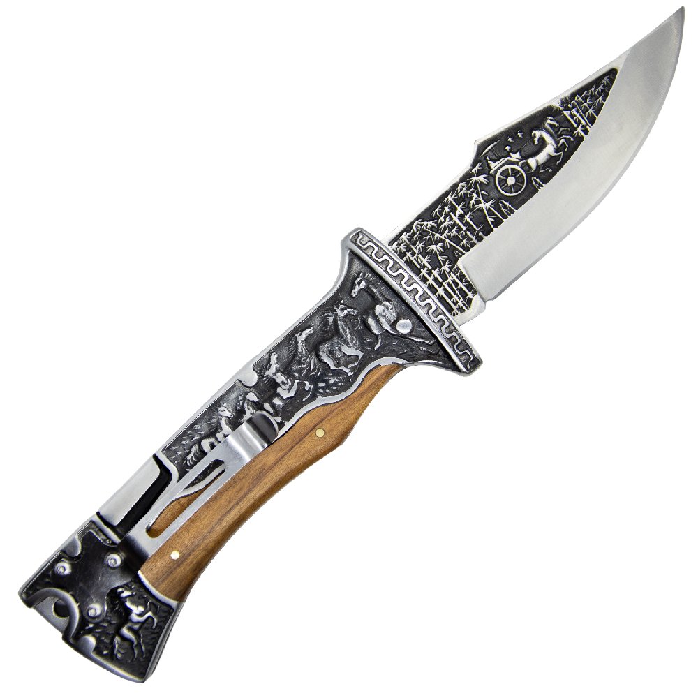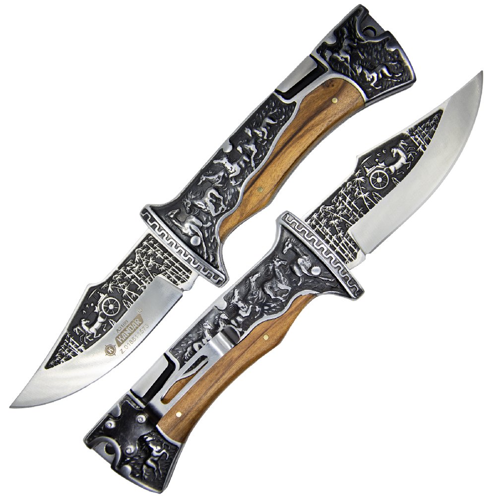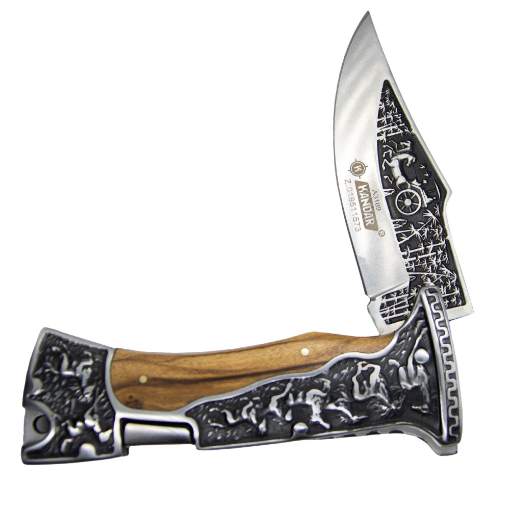 Nóż składany Kandar N349 – stal nierdzewna Z.373551, blokada Back-Lock, grawer konie i rydwan, drewniana rękojeść, klips i otwór na linkę. Elegancki nóż myśliwski i kolekcjonerski.