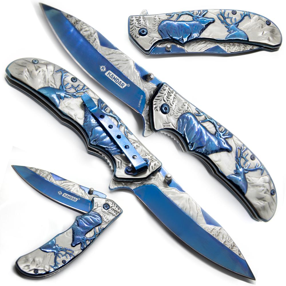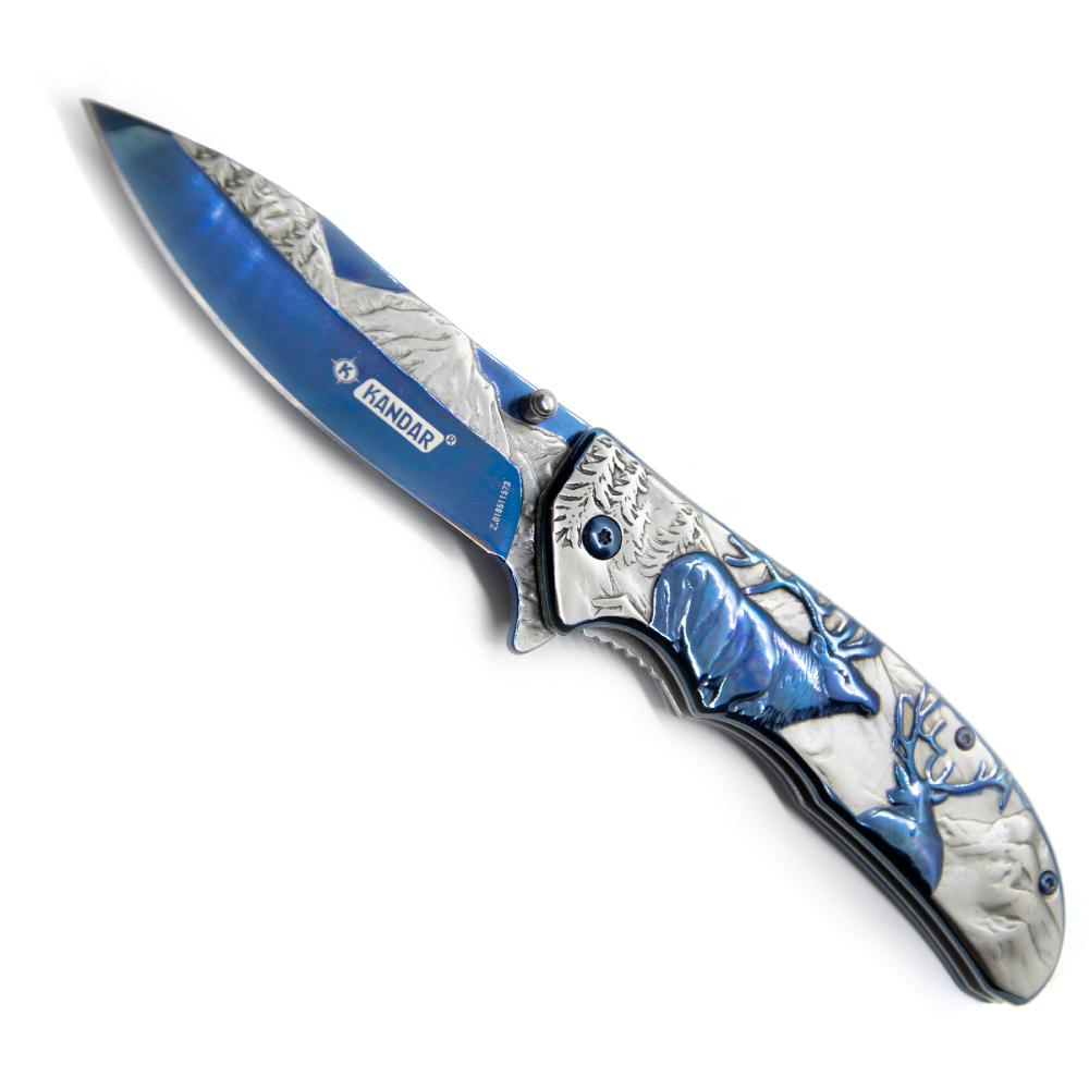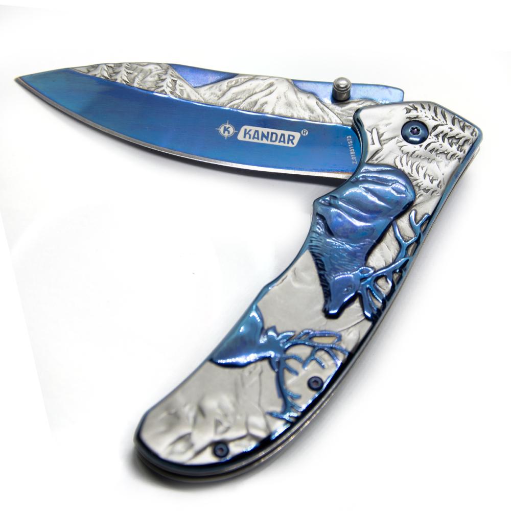 Kandar N435 Jeleń – nóż składany turystyczny ze stali nierdzewnej. Ozdobna rękojeść z motywem jelenia, kompaktowy rozmiar i praktyczny klips.