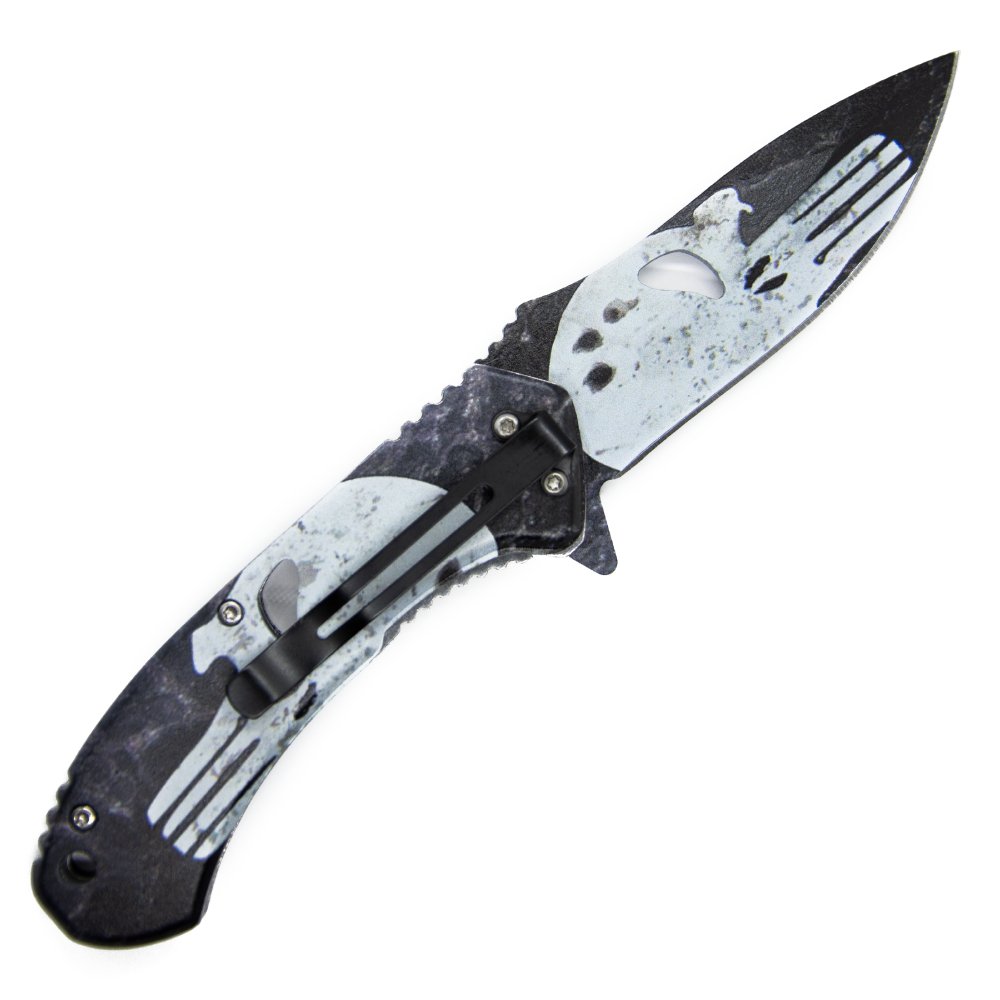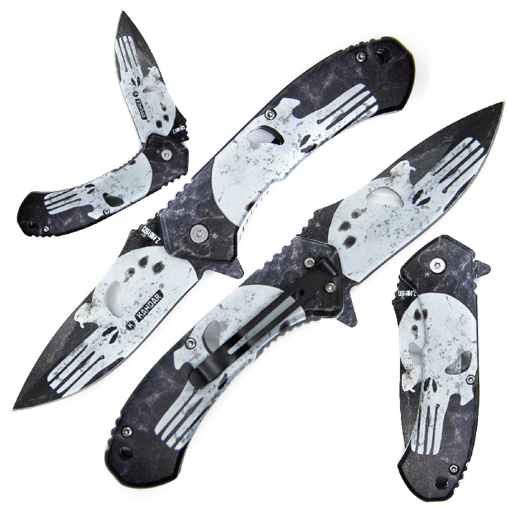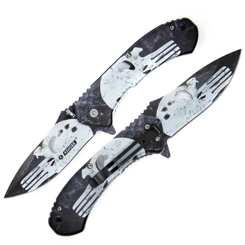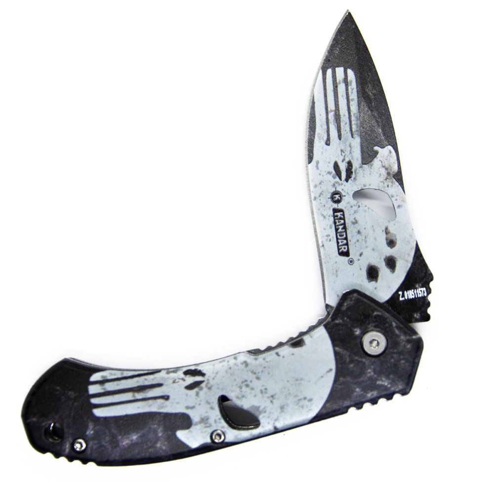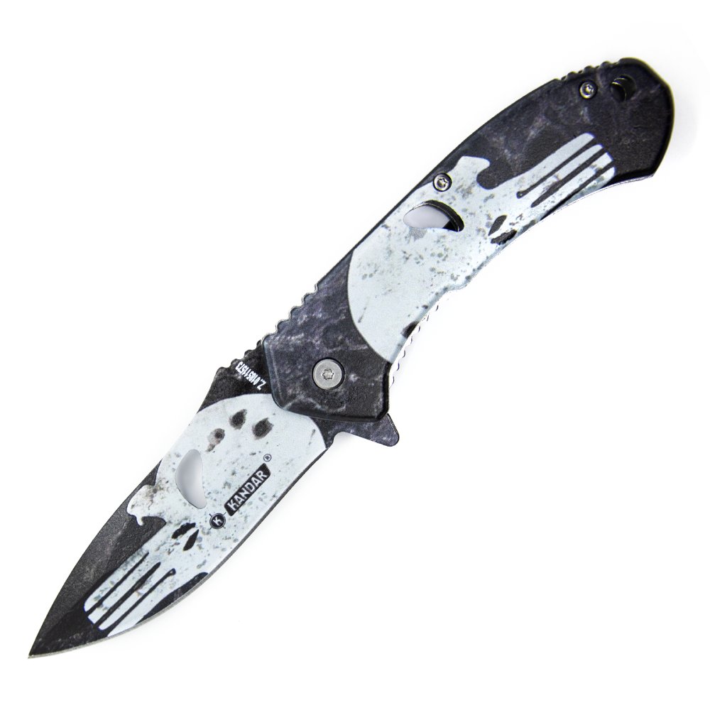 Nóż składany Kandar N616 American Skull – stal nierdzewna, blokada Liner-Lock, czarno-biała rękojeść z motywem czaszki Punisher. Turystyczny i kolekcjonerski nóż EDC.