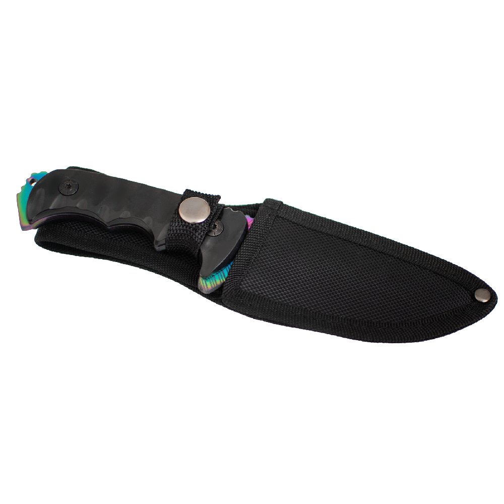 W zestawie znajduje się parciany pokrowiec zapinany na napę, który można łatwo przypiąć do pasa. Dzięki otworowi w szkielecie noża możliwe jest także dodatkowe przytroczenie linki lub smyczy, co zwiększa komfort użytkowania.