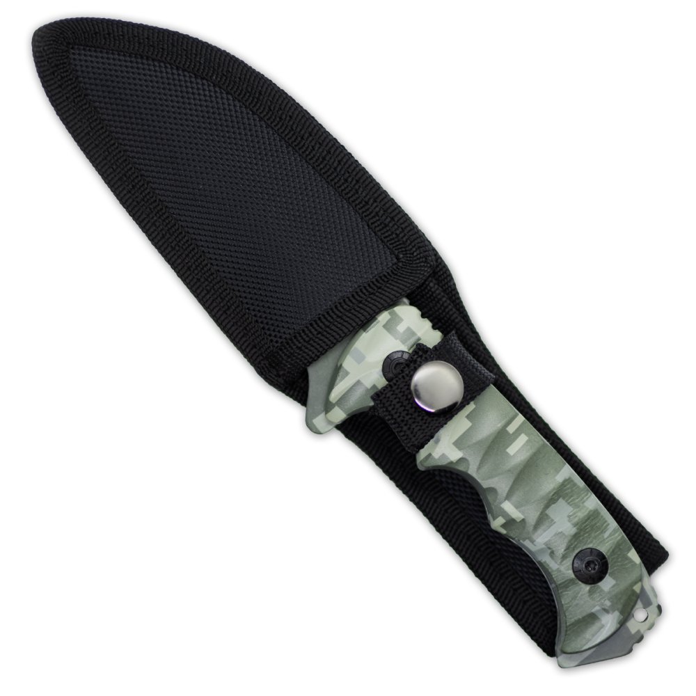 W zestawie znajduje się pokrowiec z wytrzymałego materiału Condura, zapinany na nap, który można bez problemu przytroczyć do pasa. Nóż wyposażono również w otwór do przewleczenia linki lub sznurka, co ułatwia dopasowanie do indywidualnych potrzeb użytkownika.