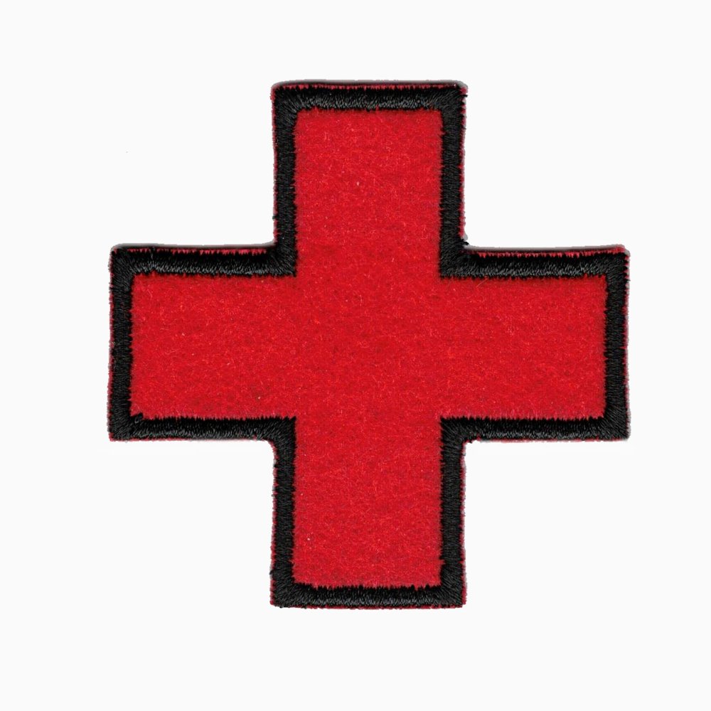 Plakietka Krzyż Medyczny czerwono-czarny – filcowa naszywka 6,5 × 6,5 cm mocowana na klej. Trwały i czytelny emblemat dla ratowników i służb medycznych.