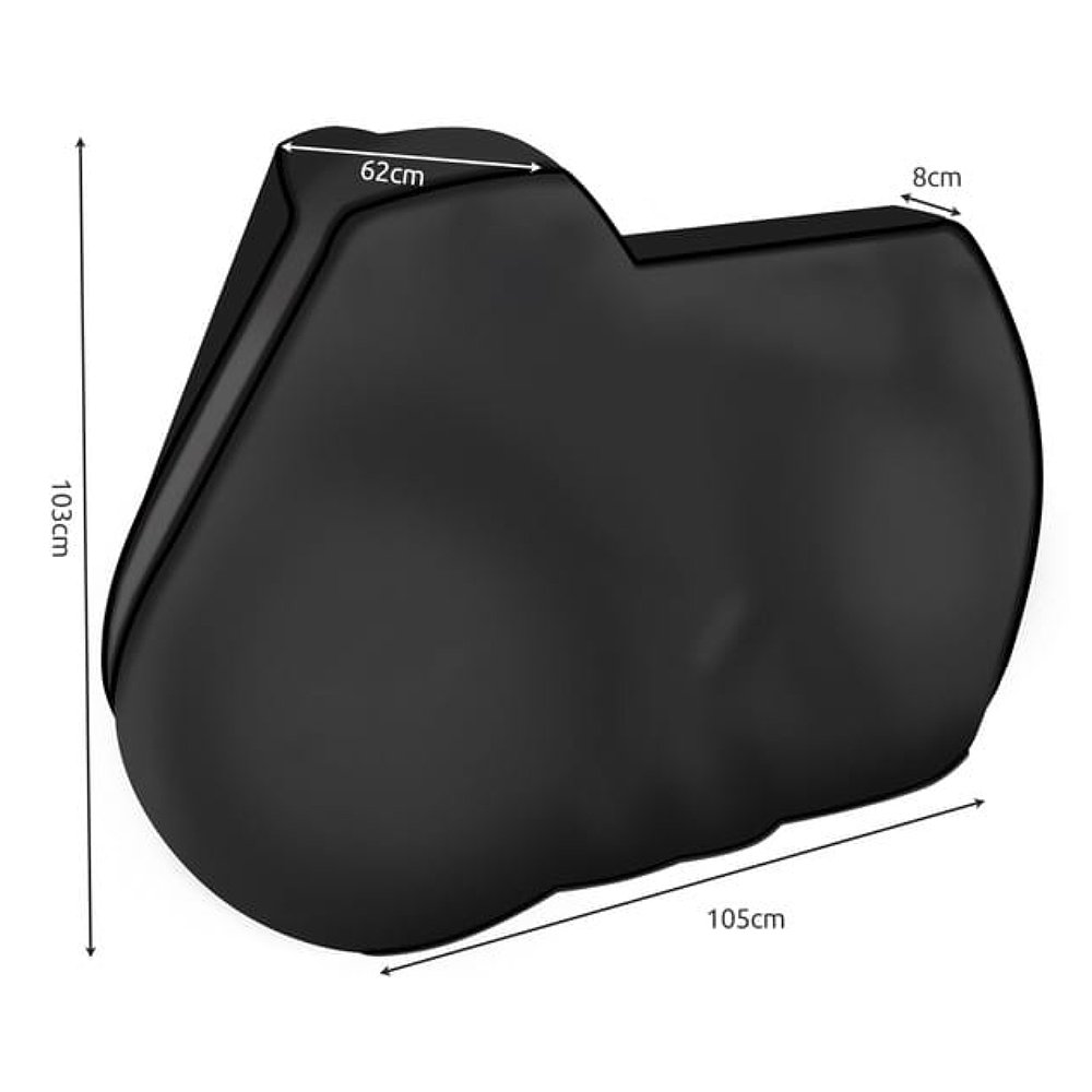 Dzięki uniwersalnym wymiarom (103 x 105 x 62 cm) pokrowiec pasuje do większości modeli rowerów, skuterów i motorowerów, gwarantując pełne osłonięcie konstrukcji. Może być stosowany zarówno na zewnątrz, jak i w garażu, chroniąc pojazd przez cały rok.