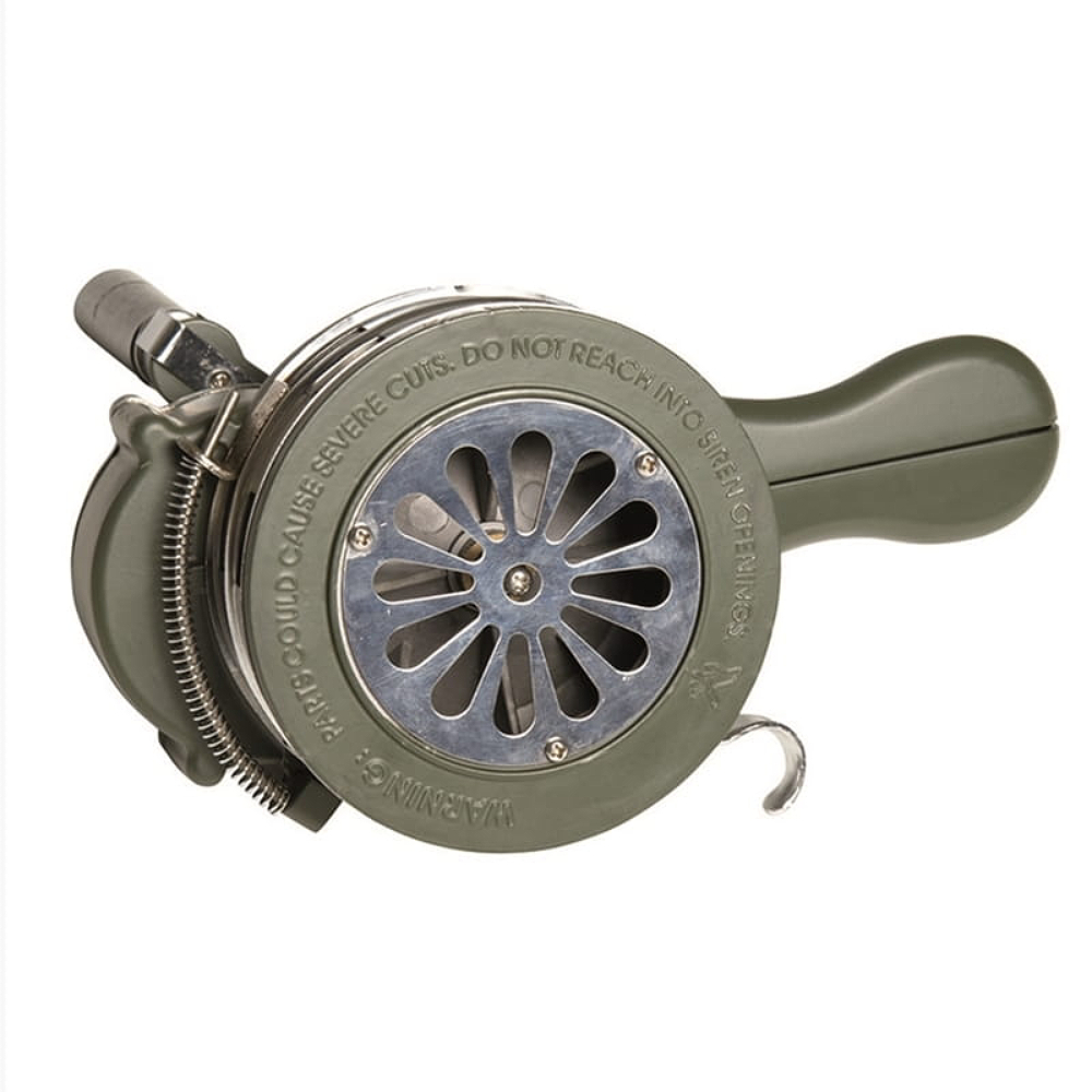 Poręczna i głośna (100dB) syrena alarmowa wykonana z aluminium. Zasilana ręcznie, niezależna od prądu. Idealna na obozowiska, budowy i dla straży pożarnej.