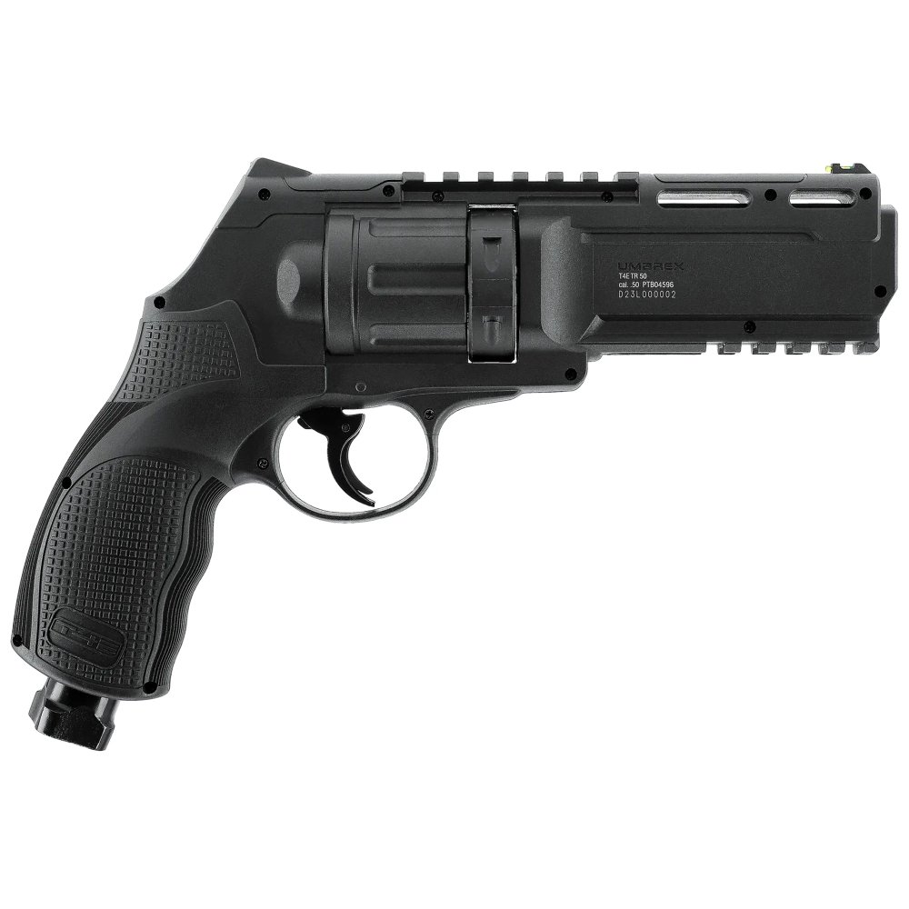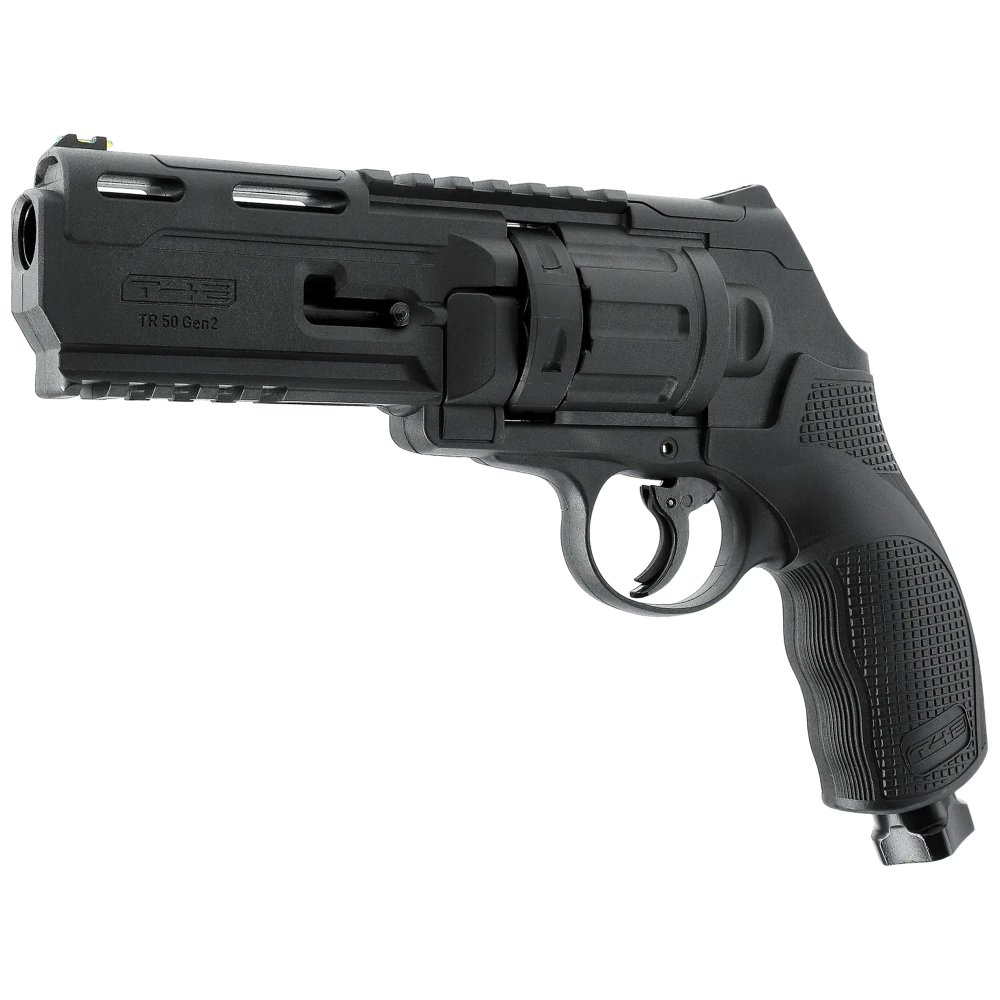 Rewolwer CO₂ RAM Combat TR50 Gen2 T4E kal. .50 – 13 J, system Quick Piercing, szyny RIS 22 mm, bęben 6 kul, różne typy amunicji RAM.