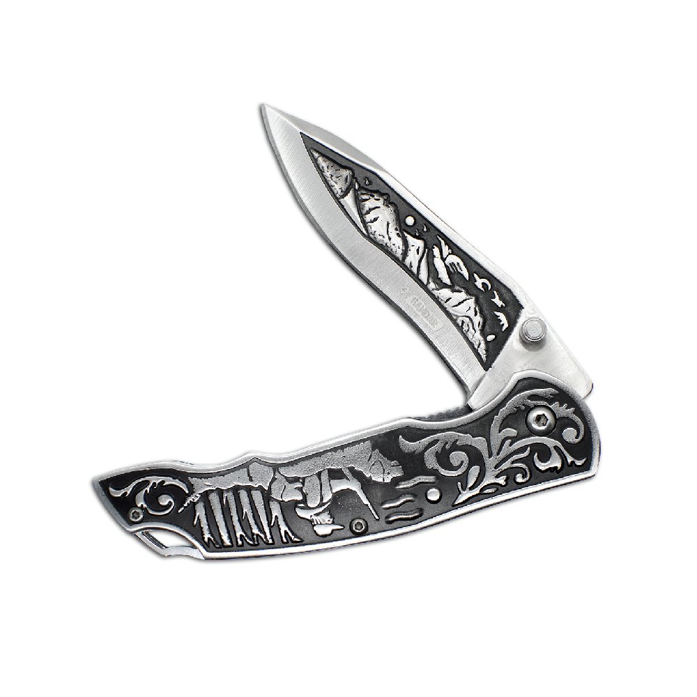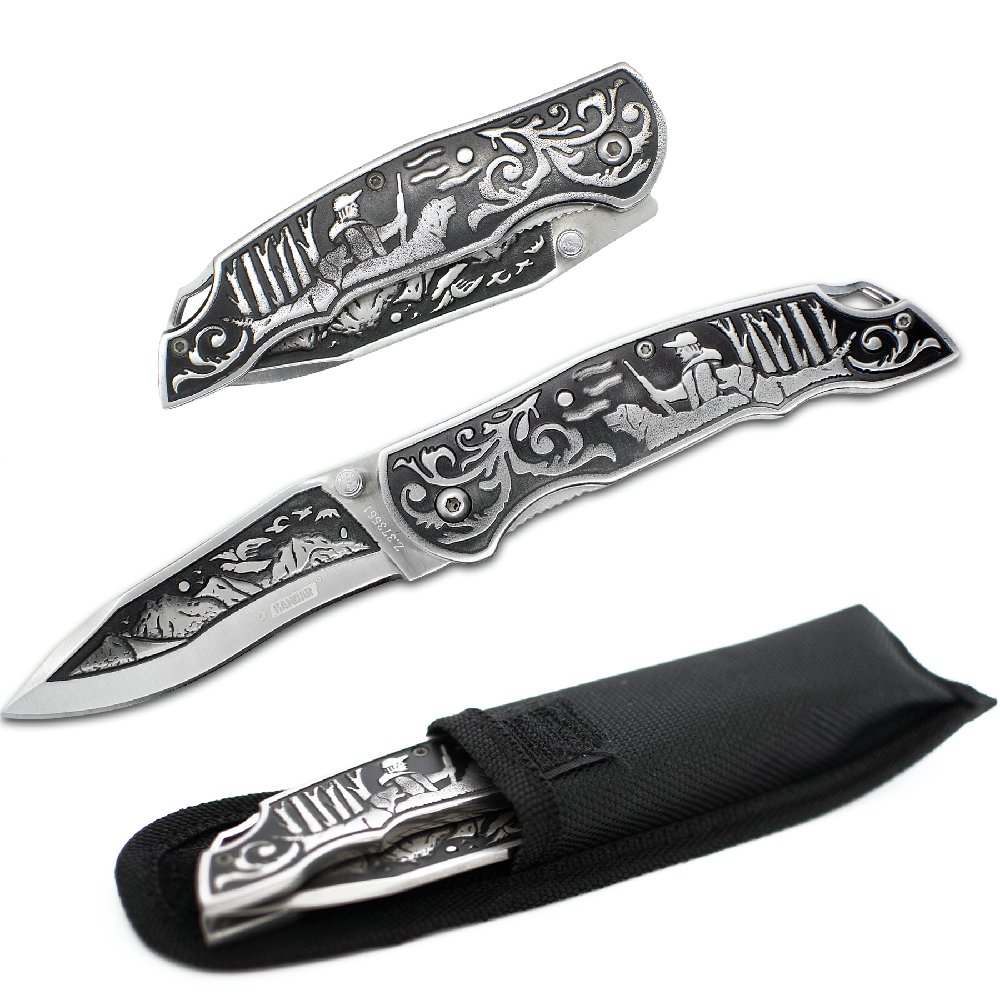 Kandar N108 to elegancki składany nóż myśliwski, który łączy funkcjonalność z unikalnym wyglądem. Dzięki bogato zdobionej głowni i rękojeści to nie tylko praktyczne narzędzie outdoorowe, ale również efektowny pomysł na prezent dla pasjonatów polowań.