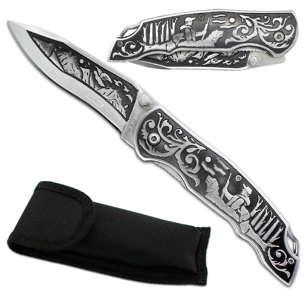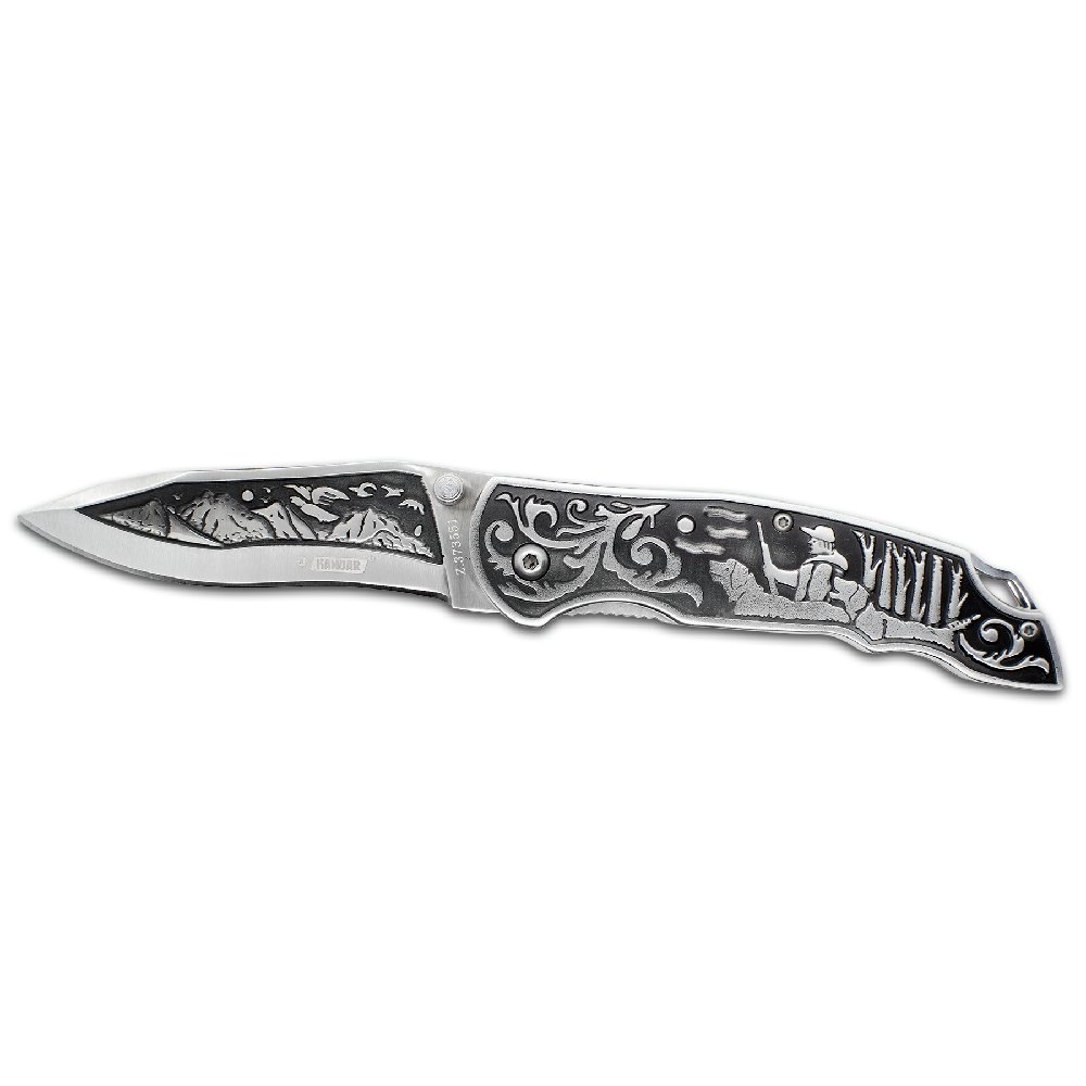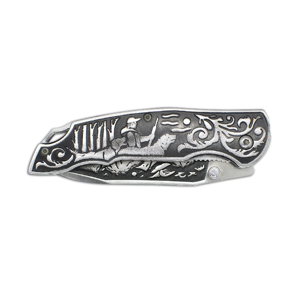 Rękojeść ze stali nierdzewnej została ozdobiona szczegółowymi grawerami o tematyce łowieckiej i pokryta antypoślizgową fakturą, zapewniającą pewny chwyt w każdych warunkach. Dodatkowe oparcie dla kciuka zwiększa stabilność, a otwór w rękojeści umożliwia zamocowanie linki lub smyczy.