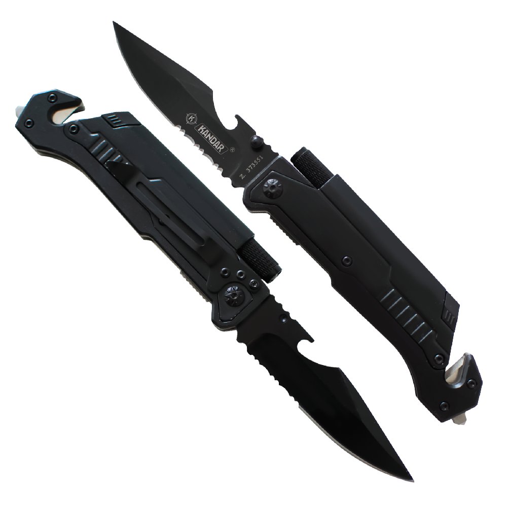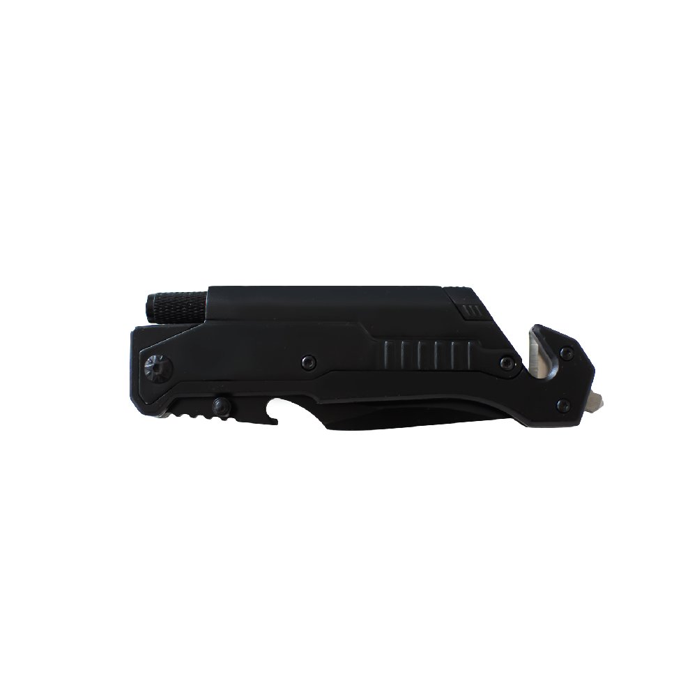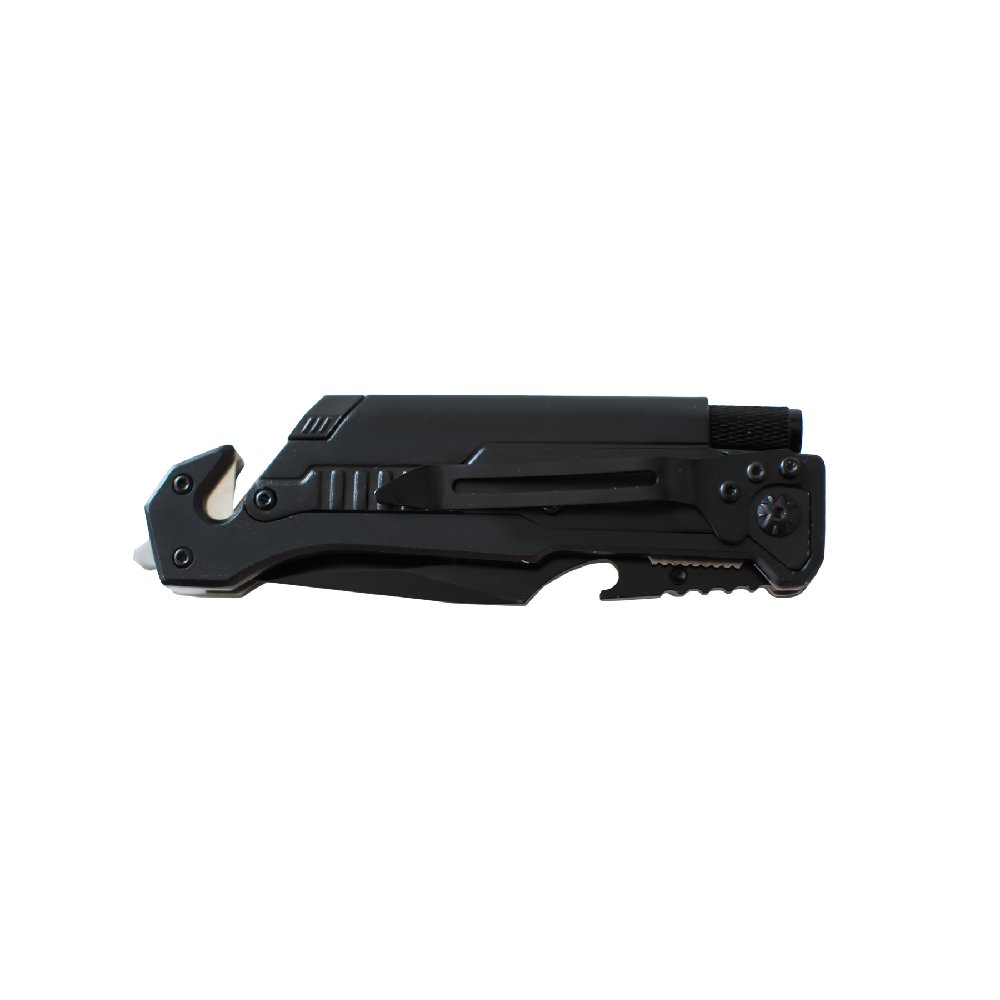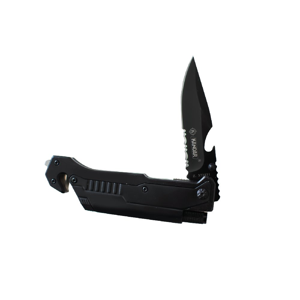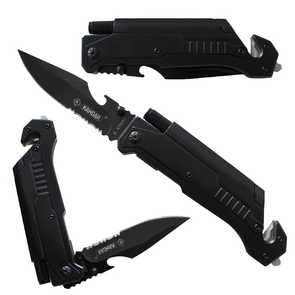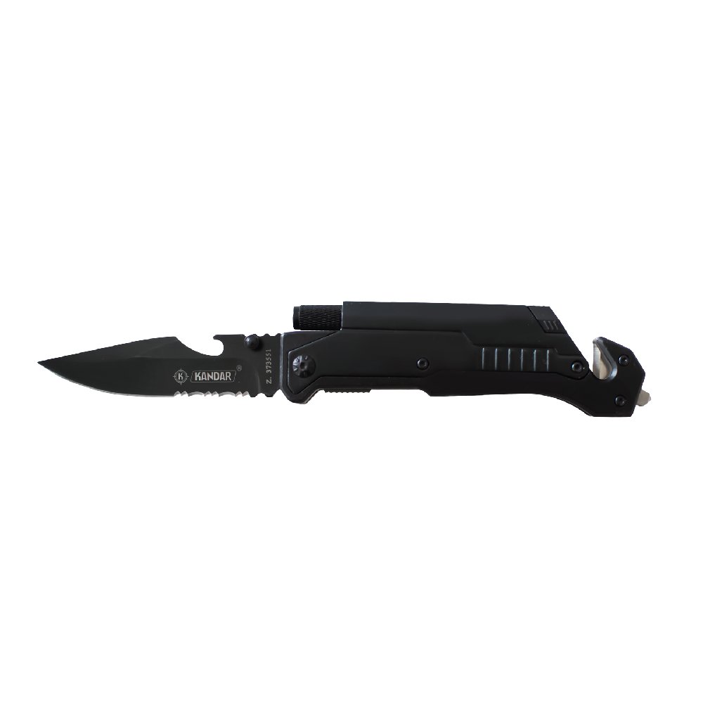 Składany nóż ratowniczy Kandar JM-K16 ze stali 440. Zbijak do szyb, przecinak pasów, krzesiwo i latarka – niezawodny nóż survivalowy i EDC.