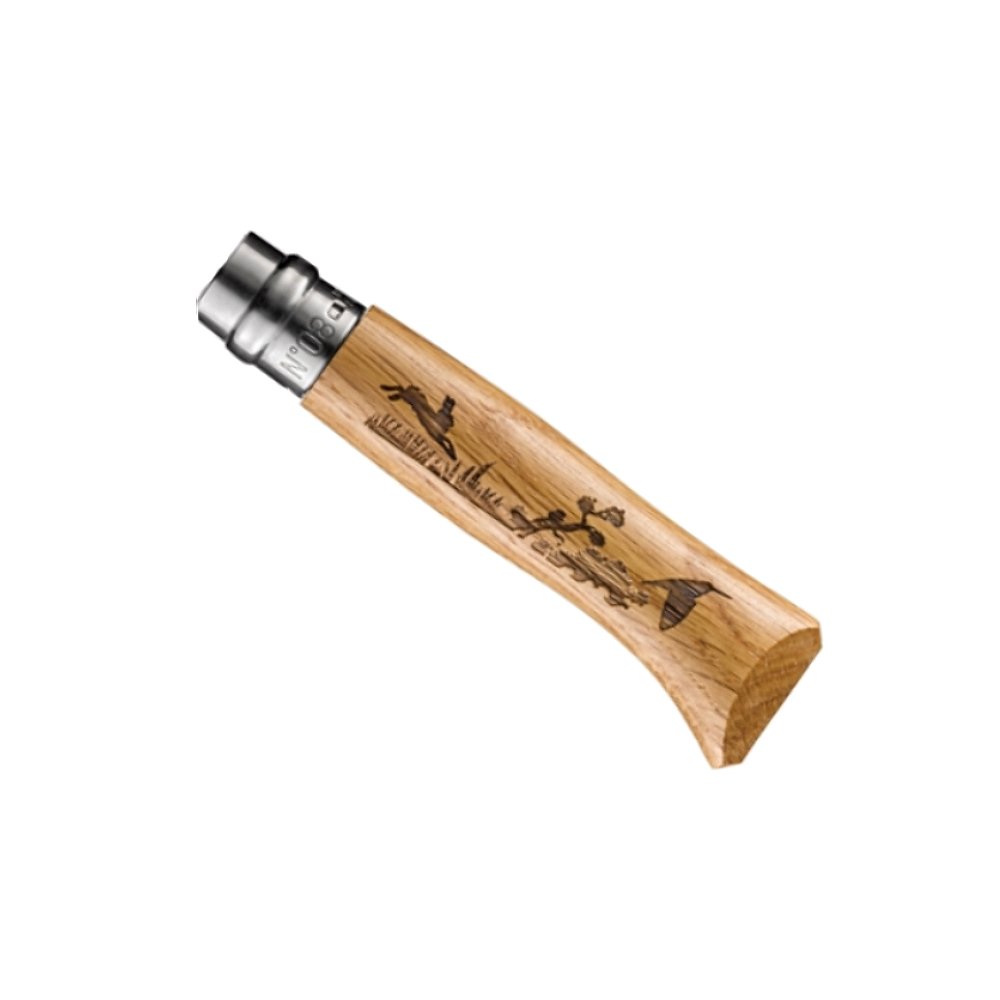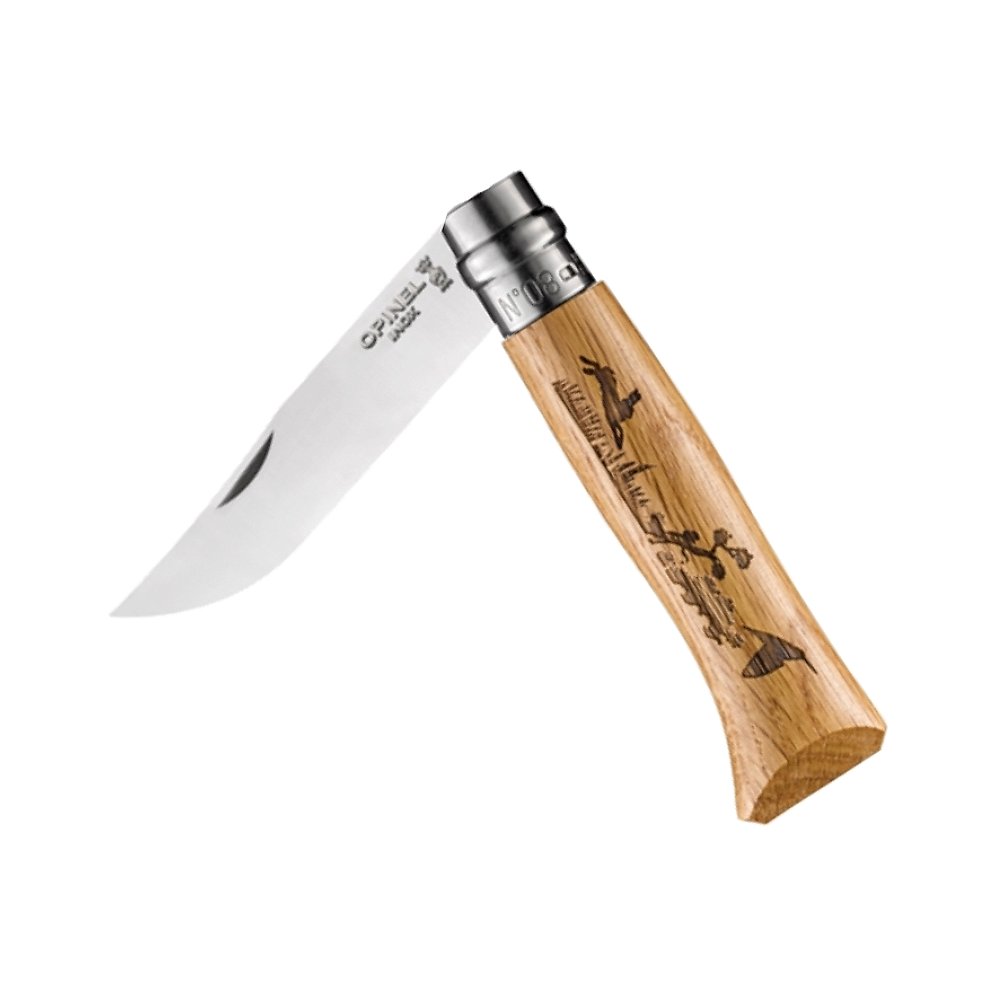 Opinel Animalia Hare No. 08 – składany nóż turystyczny z grawerem zająca. Stal nierdzewna Sandvik 12C27, blokada Virobloc, rękojeść z drewna bukszpanu. Lekki, praktyczny i kolekcjonerski.