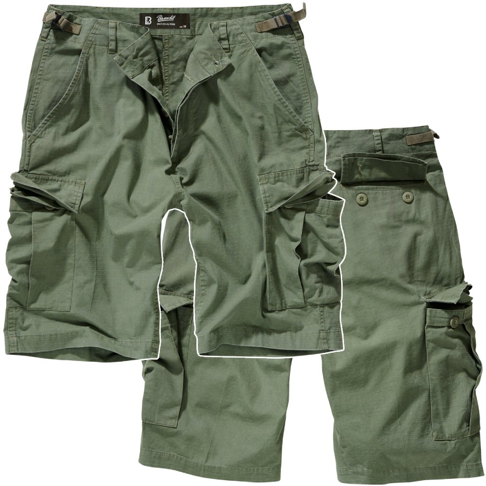 Spodenki Brandit BDU Ripstop Olive – wytrzymałe bojówki z bawełny Rip-Stop, 6 kieszeni cargo, regulacja w pasie. Idealne do outdooru i na co dzień.