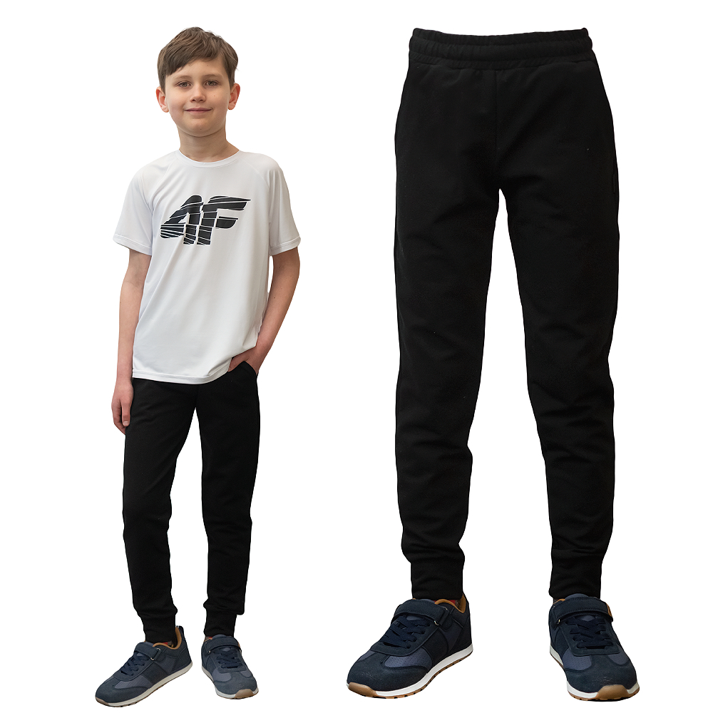 Czarne spodnie dresowe Morowo Junior dla dzieci. Polska produkcja, wysokiej jakości bawełna z elastanem. Regulowany pas, ściągacze i dwie kieszenie. Idealne do zabawy i na co dzień.