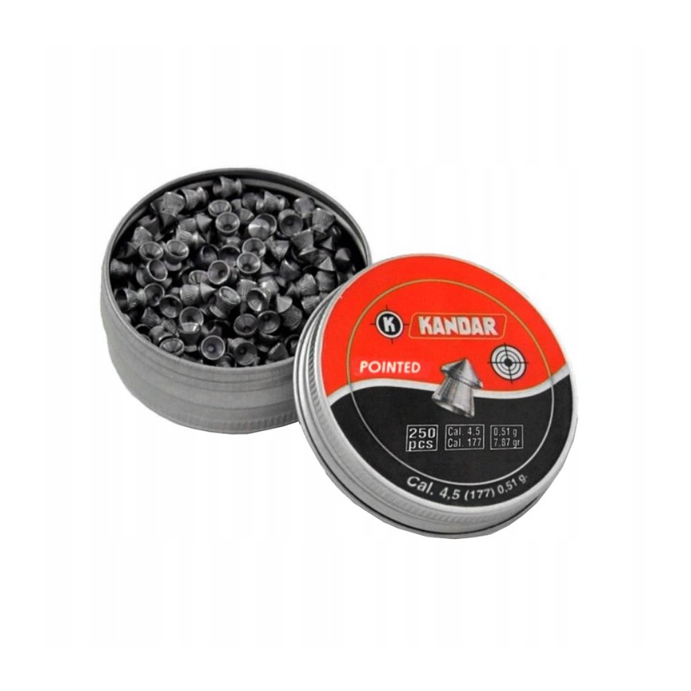 Śrut Kandar Pointed 4,5 mm ze szpiczastym czubkiem. Ołowiany, precyzyjny i celny, idealny do strzelania rekreacyjnego w puszki i cele reaktywne. Opakowanie 250 sztuk.