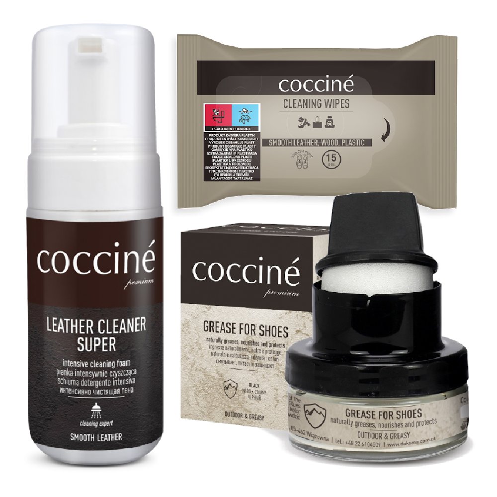 Zestaw Cocciné do pielęgnacji skóry licowej – pianka, tłuszcz i chusteczki. Czyści, odżywia i chroni skórę, wydłużając żywotność obuwia i galanterii.